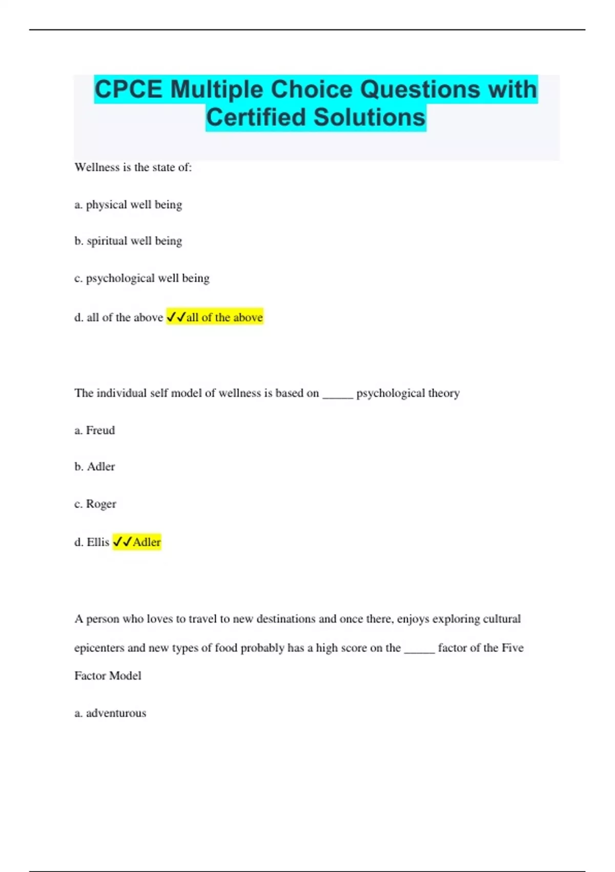 CPCE Multiple Choice Questions with Certified Solutions Wellness is the state of: a. physical well being b. spiritual well being c. psychological well being d. all of the above all of the above The individual self model of wellness is based on _____ psychological theory a. Freud b. Adler c. Roger d. Ellis Adler A person who loves to travel to new destinations and once there, enjoys exploring cultural epicenters and new types of food probably has a high score on the _____ factor of the Five Factor Model a. adventurou