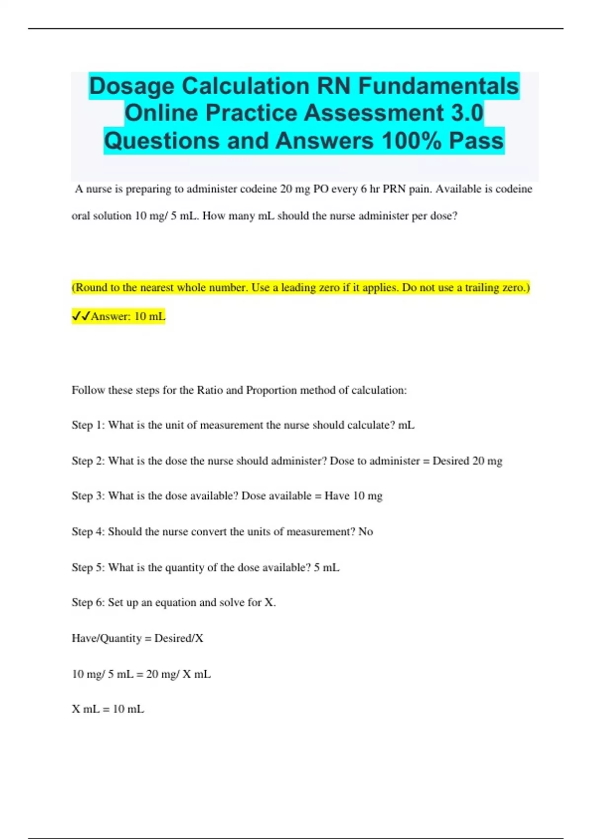 Dosage Calculation RN Fundamentals Online Practice Assessment 3.0 Questions and Answers 100% Pass A nurse is preparing to administer codeine 20 mg PO every 6 hr PRN pain. Available is codeine oral solution 10 mg/ 5 mL. How many mL should the nurse administer per dose? (Round to the nearest whole number. Use a leading zero if it applies. Do not use a trailing zero.) Answer: 10 mL Follow these steps for the Ratio and Proportion method of calculation: Step 1: What is the unit of measurement the nurse should calculate? mL Step 2: What is the dose the nurse should administer? Dose to administer = Desired 20 mg Step 3: What is the dose available? Dose available = Have 10 mg Step 4: Should the nurse convert the units of measurement? No Step 5: What is the quantity of the dose available? 5 mL Step 6: Set up an equation and solve for X. Have/Quantity = Desired/X 10 mg/ 5 mL = 20 mg/ X mL X mL = 10 mL