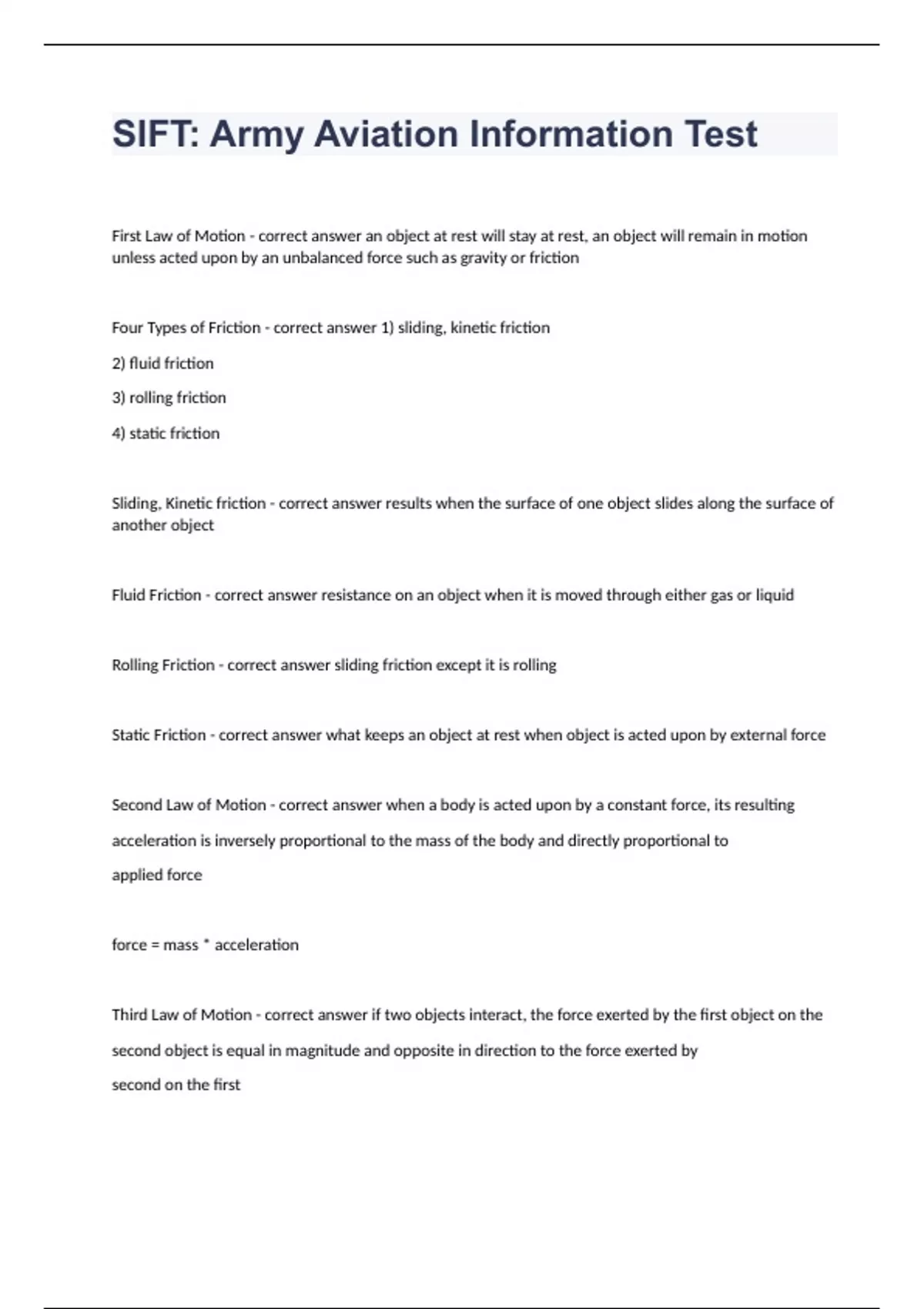 SIFT Army Aviation Information Test With Correct Solutions 2024. First Law of Motion - correct answer an object at rest will stay at rest, an object will remain in motion unless acted upon by an unbalanced force such as gravity or friction Four Types of Friction - correct answer 1) sliding, kinetic friction 2) fluid friction 3) rolling friction 4) static friction Sliding, Kinetic friction - correct answer results when the surface of one object slides along the surface of another object Fluid Friction - correct answer resistance on an object when it is moved through either gas or liquid Rolling Friction - correct answer sliding friction except it is rolling Static Friction - correct answer what keeps an object at rest when object is acted upon by external force Second Law of Motion - correct answer when a body is acted upon by a constant force, its resulting acceleration is inversely proportional to the mass of the body and directly proportional to applied force force = mass * acceleration Third Law of Motion - correct answer if two objects interact, the force exerted by the first object on the second object is equal in magnitude and opposite in direction to the force exerted by second on the first