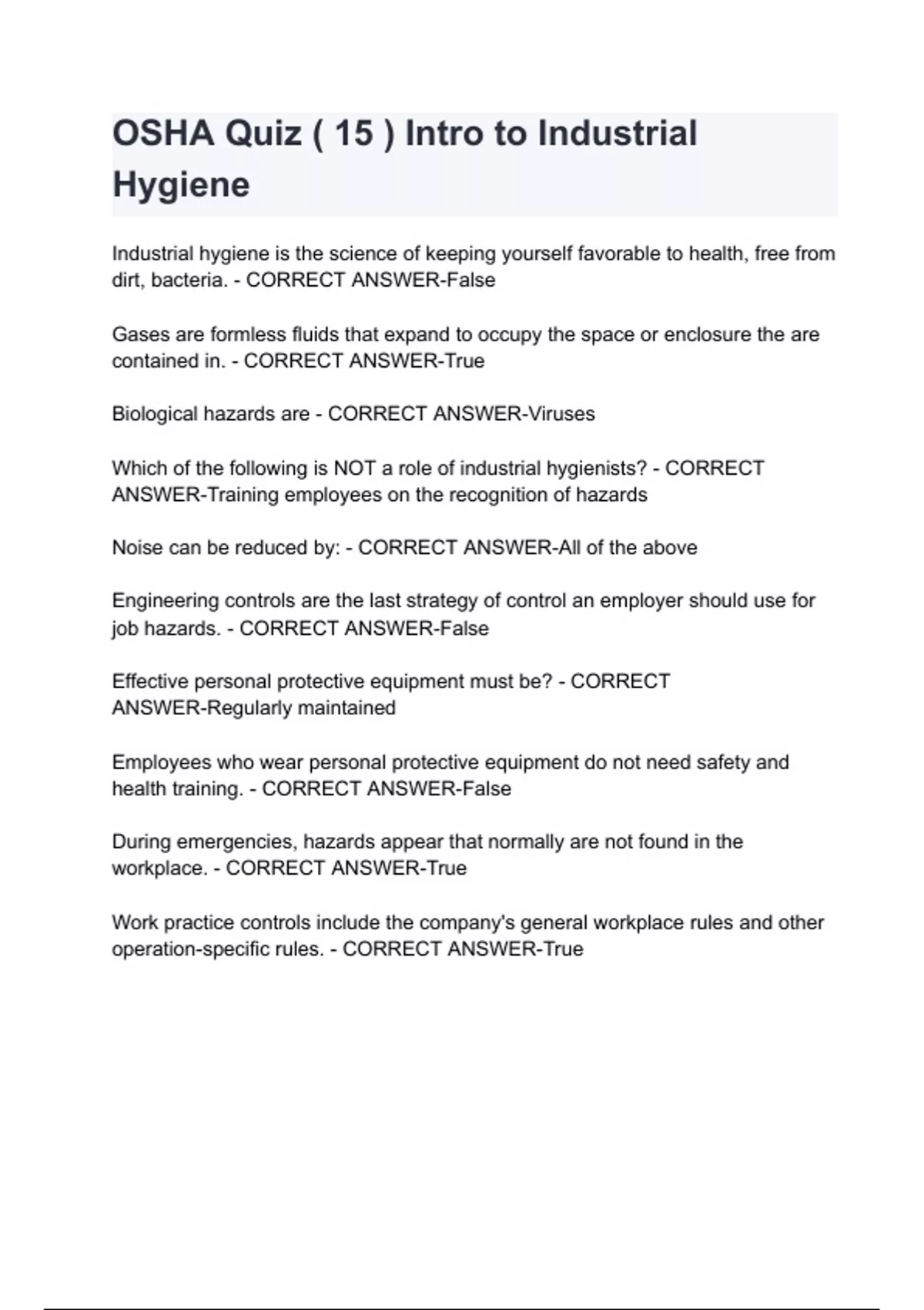 OSHA Quiz ( 15 ) Intro to Industrial Hygiene Industrial hygiene is the science of keeping yourself favorable to health, free from dirt, bacteria. - CORRECT ANSWER-False Gases are formless fluids that expand to occupy the space or enclosure the are contained in. - CORRECT ANSWER-True Biological hazards are - CORRECT ANSWER-Viruses Which of the following is NOT a role of industrial hygienists? - CORRECT ANSWER-Training emp