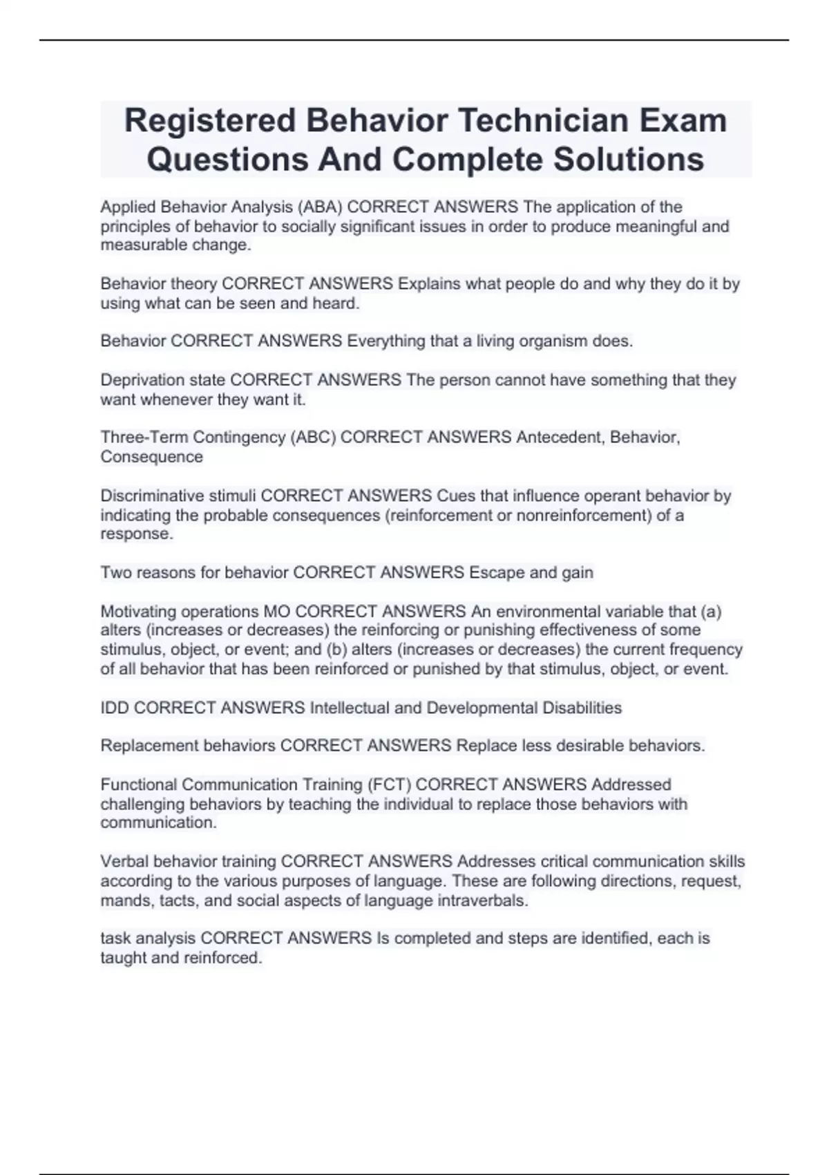 Registered Behavior Technician Exam Questions And Complete Solutions
