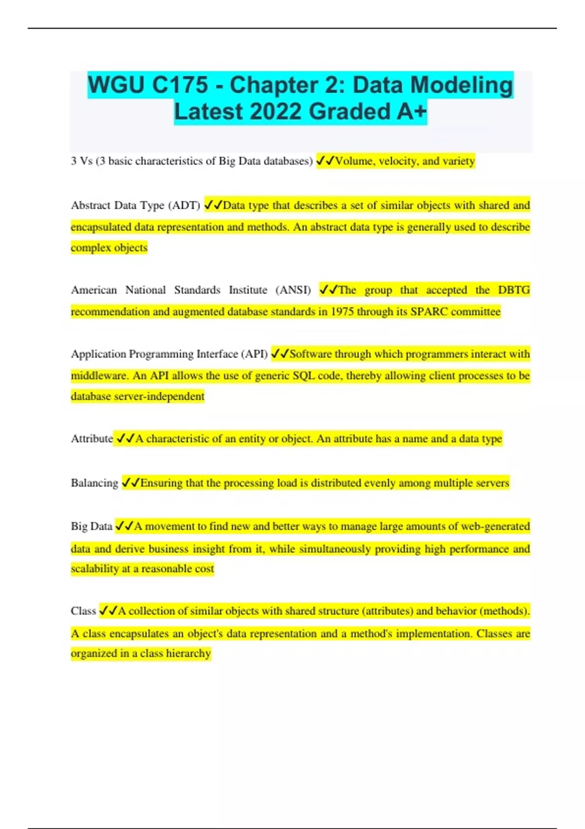 WGU C175 - Chapter 2: Data Modeling Latest 2022 Graded A+ 3 Vs (3 basic characteristics of Big Data databases) Volume, velocity, and variety Abstract Data Type (ADT) Data type that describes a set of similar objects with shared and encapsulated data representation and methods. An abstract data type is generally used to describe complex objects American National Standards Institute (ANSI) The group that accepted the DBTG recommendation and augmented database standards in 1975 through its SPARC committee Application Programming Interface (API) Software through which programmers interact with middleware. An API allows the use of generic SQL code, thereby allowing client processes to be database server-independent Attribute A characteristic of an entity or object. An attribute has a name and a data type Balancing Ensuring that the processing load is distributed evenly among multiple servers Big Data A movement to find new and better ways to manage large amounts of web-generated data and derive business insight from it, while simultaneously providing high performance and scalability at a reasonable cost Class A collection of similar objects with shared structure (attributes) and behavior (methods). A class encapsulates an object's data representation and a method's implementation. Classes are organized in a class hierarchy