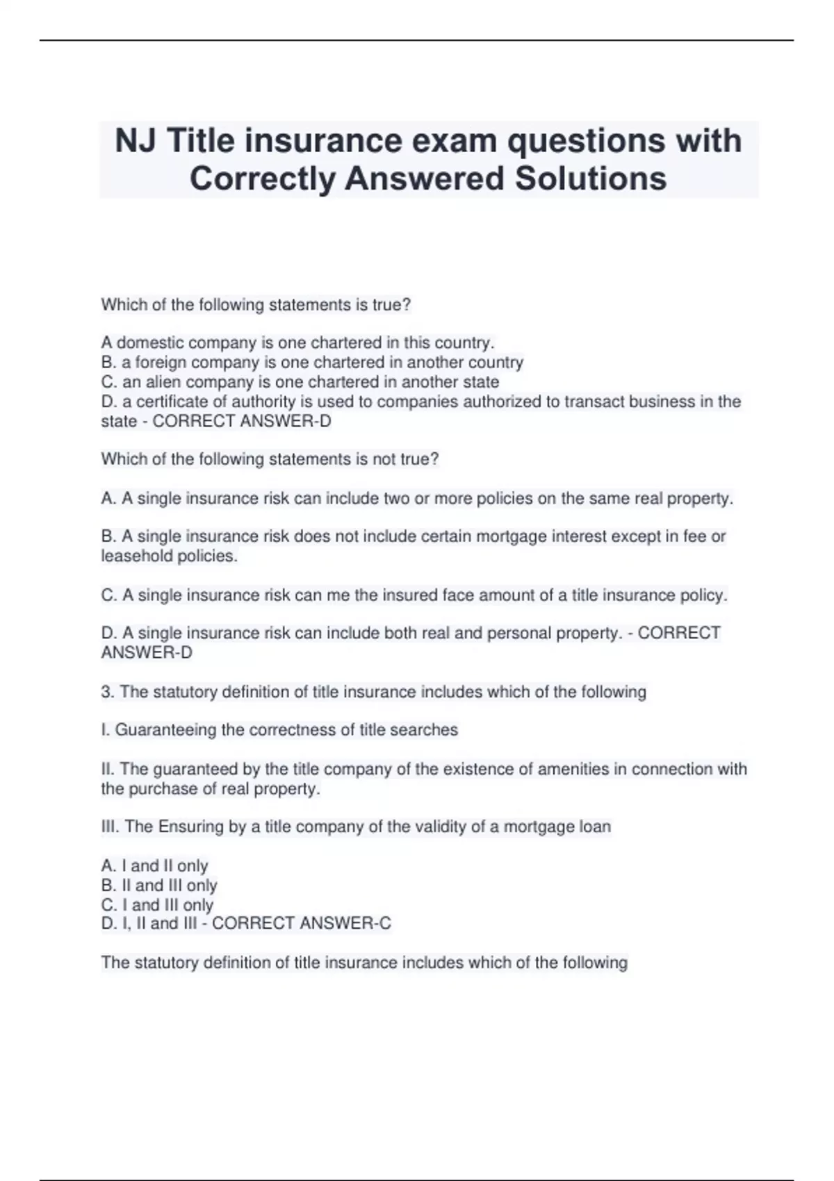 NJ Title insurance exam questions with Correctly Answered Solutions Which of the following statements is true? A domestic company is one chartered in this country. B. a foreign company is one chartered in another country C. an alien company is one chartered in another state D. a certificate of authority is used to companies authorized to transact business in the state - CORRECT ANSWER-D Which of the following statements is not true? A. A single insurance risk can include two or more policies on the same real property. B. A single insurance risk does not include certain mortgage interest except in fee or leasehold policies. C. A single insurance risk can me the insured face amount of a title insurance policy. D. A single insurance risk can include both real and personal property. - CORRECT ANSWER-D 3. The statutory definition of title insurance includes which of the following I. Guaranteeing the correctness of title searches II. The guaranteed by the title company of the existence of amenities in connection with the purchase of real property. III. The Ensuring by a title company of the validity of a mortgage loan A. I and II only B. II and III only C. I and III only D. I, II and III - CORRECT ANSWER-C The statutory definition of title insurance includes which of the following I. Guaranteeing the credit worthiness of the mortgagor II. Indemnifying owners against loss suffered as a result of the title being on marketable III. Indemnifying owners against hidden property defects in the title to real policy. A. I and II only B. II and III only C. I and III only D. I, II and III - CORRECT ANSWER-B title insurance companies are permitted to do which of the following I. Guarantee the completion of construction projects II. Guarantee the repayment of mortgages III. Indemnify a lender for losses resulting from acts of the closing attorney or closing agent A. I and II only B. II and III only C. I and III only D. III only - CORRECT ANSWER-D In New Jersey title insurance companies are not required to do which of the following? A. Become a member of a reading bureau in order to file their forms and rates B. File their forms with the New Jersey Dep
