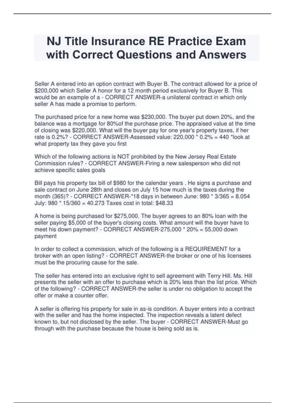 NJ Title Insurance RE Practice Exam with Correct Questions and Answers Seller A entered into an option contract with Buyer B. The contract allowed for a price of $200,000 which Seller A honor for a 12 month period exclusively for Buyer B. This would be an example of a - CORRECT ANSWER-a unilateral contract in which only seller A has made a promise to perform. The purchased price for a new home was $230,000. The buyer put down 20%, and the balance was a mortgage for 80%of the purchase price. The appraised value at the time of closing was $220,000. What will the buyer pay for one year's property taxes, if her rate is 0.2%? - CORRECT ANSWER-Assessed value: 220,000 * 0.2% = 440 *look at what property tax they gave you first Which of the following actions is NOT prohibited by the New Jersey Real Estate Commission rules? - CORRECT ANSWER-Firing a new salesperson who did not achieve specific sales goals Bill pays his property tax bill of $980 for the calendar years . He signs a purchase and sale contract on June 28th and closes on July 15 how much is the taxes during the month (365)? - CORRECT ANSWER-*18 days in between June: 980 * 3/365 = 8.054 July: 980 * 15/360 = 40.273 Taxes cost in total: $48.33 A home is being purchased for $275,000. The buyer agrees to an 80% loan with the seller paying $5,000 of the buyer's closing costs. What amount will the buyer have to meet his down payment? - CORRECT ANSWER-275,000 * 20% = 55,000 down payment In order to collect a commission, which of the following is a REQUIREMENT for a broker with an open listing? - CORRECT ANSWER-the broker or one of his licensees must be the procuring cause for the sale. The seller has entered into an exclusive right to sell agreement with Terry Hill. Ms. Hill presents the seller with an offer to purchase which is 20% less than the list price. Which of the following? - CORRECT ANSWER-the seller is under no obligation to accept the offer or make a counter offer. A seller is offering his property for sale in as-is condition. A buyer enters into a contract with the seller and has the home inspected. The inspection reveals a latent defect known to, but not disclosed by the seller. The buyer - CORRECT ANSWER-Must go through with the purchase because the house is being sold as is. A lender requested that the entire loan balance be paid immediately because the property on which the loan was made had been sold. What clause in the mortgage loan allows this? - CORRECT ANSWER-Alienation Clause A buyer informs a listing salesperson that the buyer plans to subdivide the property and then list it with the salesperson as soon as the offer is accepted. The salesperson makes no mention of the seller and the buyer's offer is then accepted. The salesperson's conducted is in violation of the New Jersey License Law because the salesperson failed to? - CORRECT ANSWER-Disclose to the seller a potential conflict of interest Latino families were beginning to move into a neighborhood that had previously been all white. A local broker passed out flyers to homeowners that said, "sell now before it's too late! We have homes with attractive financing and good schools." These flyers would be viewed by the courts as? - CORRECT ANSWER-Blockbusting Which of the following statements about airborne radon is TRUE - CORRECT ANSWER-It is inexpensively detected and mitigated Which of the following statements would most likely be considered mere "puffing"? - CORRECT ANSWER-- This area is expected to increase in value by 25% within the next year - Best buy you will find all year A licensee has signed a listing with a seller to market a commercially zoned building and lot. The licensee's responsibility to the prospective buyer must include? - CORRECT ANSWER-Providing agency disclosure to prospective buyers. A landlord's lease prohibits tenants from altering the property in any way. a woman who uses a wheelchair cannot maneuver over the doorstep into the apartment by herself. In addition she cannot access the bathroom facilities in her wheelchair. Which of the following is true? - CORRECT ANSWER-The tenant is entitled to make the alterations necessary for apartment accessibility. Which if the following statements concerning an agreement of sale prepared by a licensee in accordance with New Jersey License Law is correct? - CORRECT ANSWER-The contract must include the attorney general memorandum on discrimination Mr. Jones owns a multi-tenant office building and leases individual spaces. The monthly fixed rent payment includes all operating expenses. This form of lease is called a? - CORRECT ANSWER-Triple Net Lease A seller discovers that the property he owns is worth less than the outstanding mortgage balance. He may be able to sell the property if this lender agrees to a? - CORRECT ANSWER-A short sal