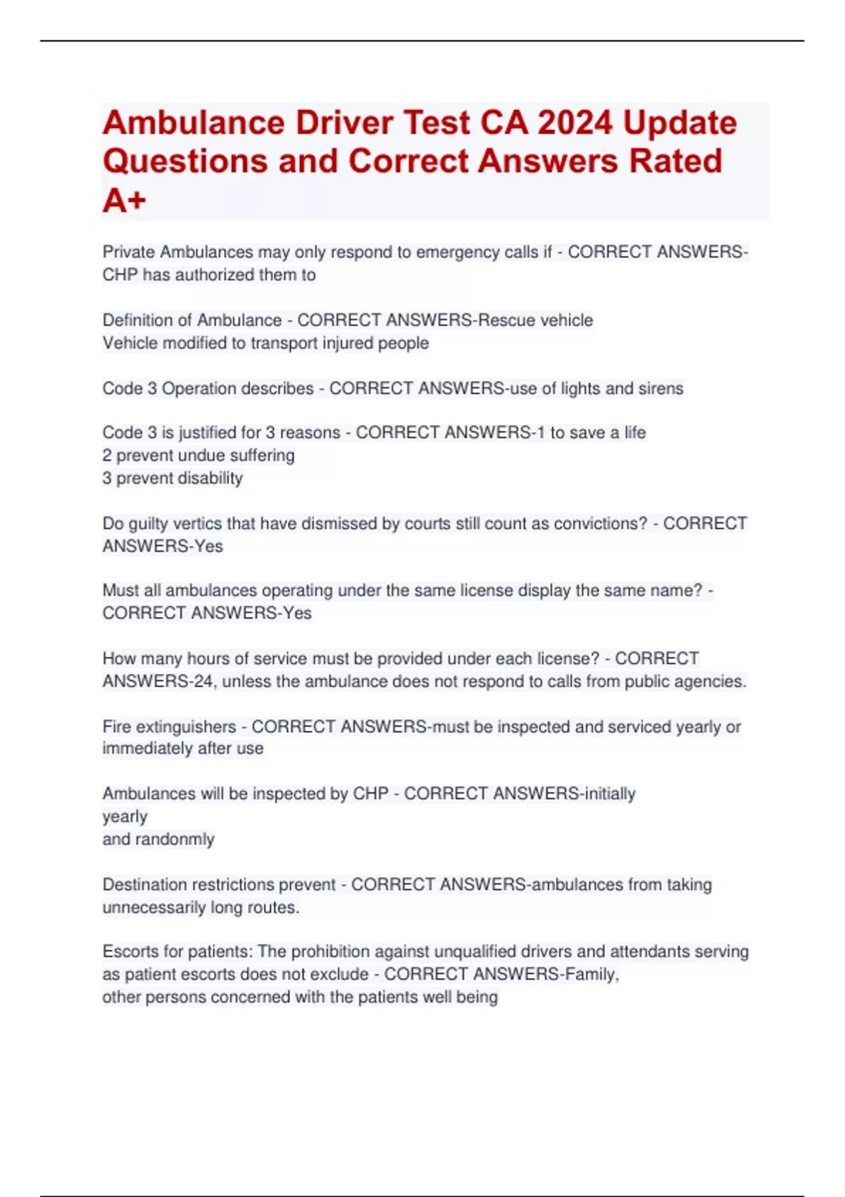 Ambulance Driver Test CA 2024 Update Questions and Correct Answers Rated A+