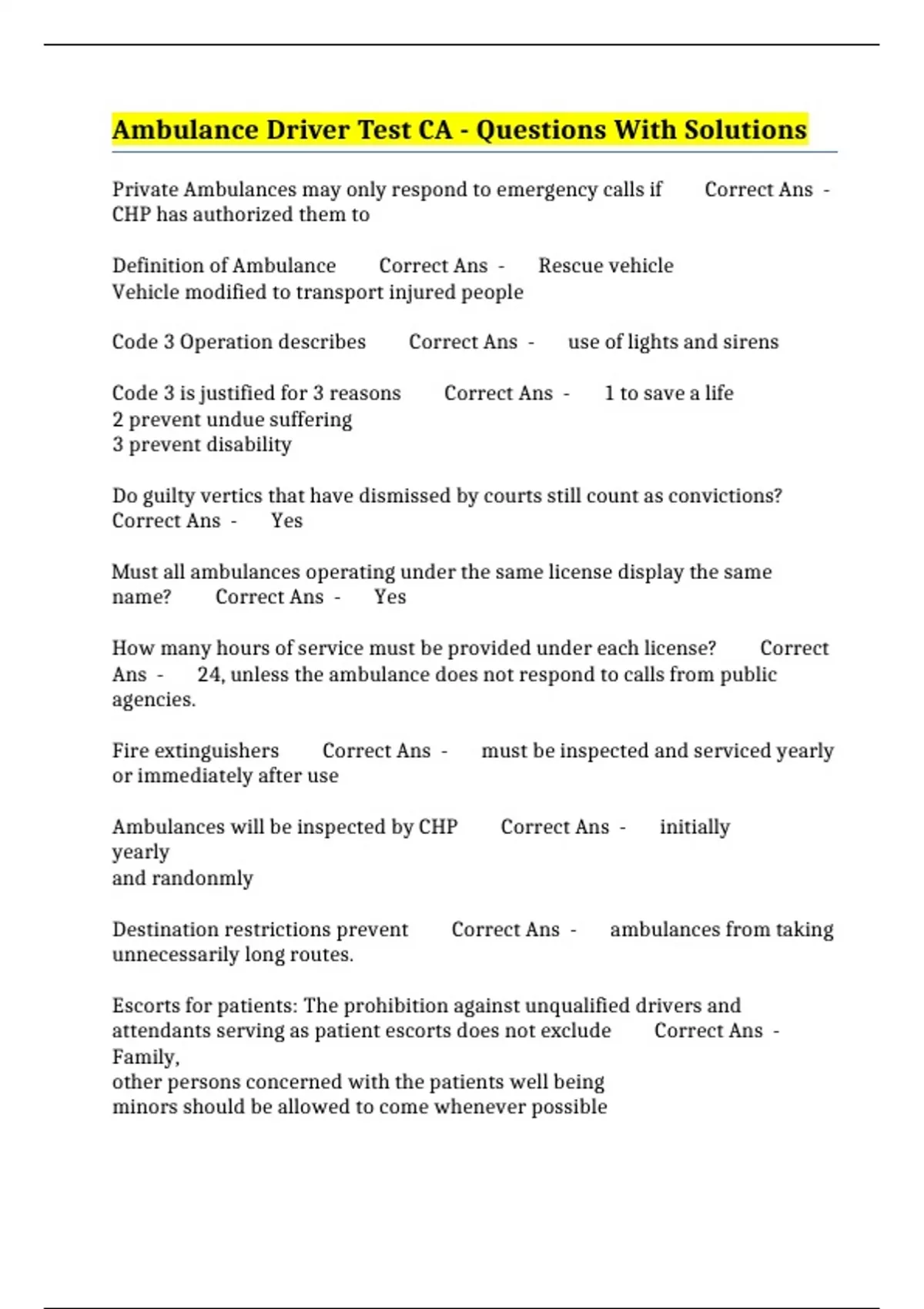 Ambulance Driver Test CA - Questions With Solutions