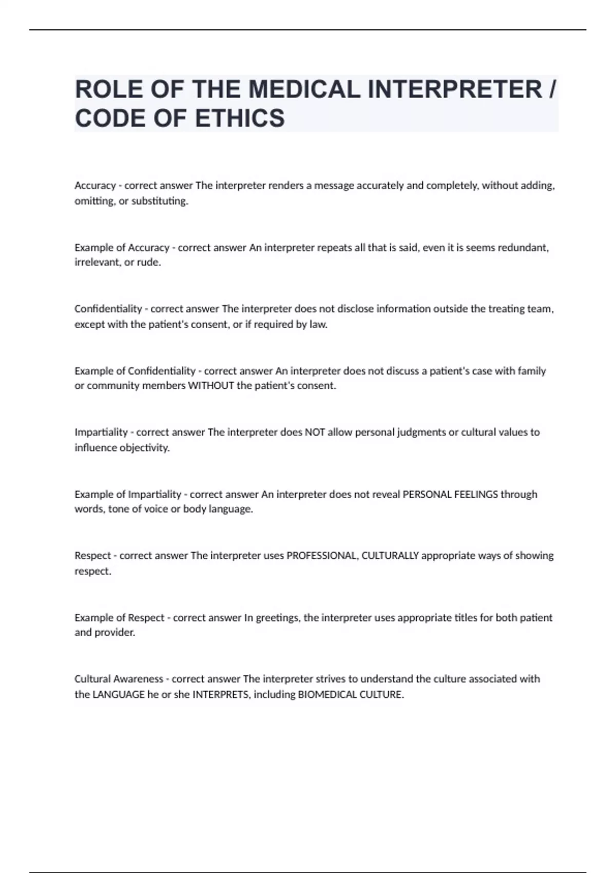 ROLE OF THE MEDICAL INTERPRETER / CODE OF ETHICSAccuracy - correct answer The interpreter renders a message accurately and completely, without adding, omitting, or substituting. Example of Accuracy - correct answer An interpreter repeats all that is said, even it is seems redundant, irrelevant, or rude. Confidentiality - correct answer The interpreter does not disclose information outside the treating team, except with the patient's consent, or if required by law. Example of Confidentiality - correct answer An interpreter does not discuss a patient's case with family or community members WITHOUT the patient's consent. Impartiality - correct answer The interpreter does NOT allow personal judgments or cultural values to influence objectivity. Example of Impartiality - correct answer An interpreter does not reveal PERSONAL FEELINGS through words, tone of voice or body language. Respect - correct answer The interpreter uses PROFESSIONAL, CULTURALLY appropriate ways of showing respect. Example of Respect - correct answer In greetings, the interpreter uses appropriate titles for both patient and provider. Cultural Awareness - correct answer The interpreter strives to understand the culture associated with the LANGUAGE he or she INTERPRETS, including BIOMEDICAL CULTURE.