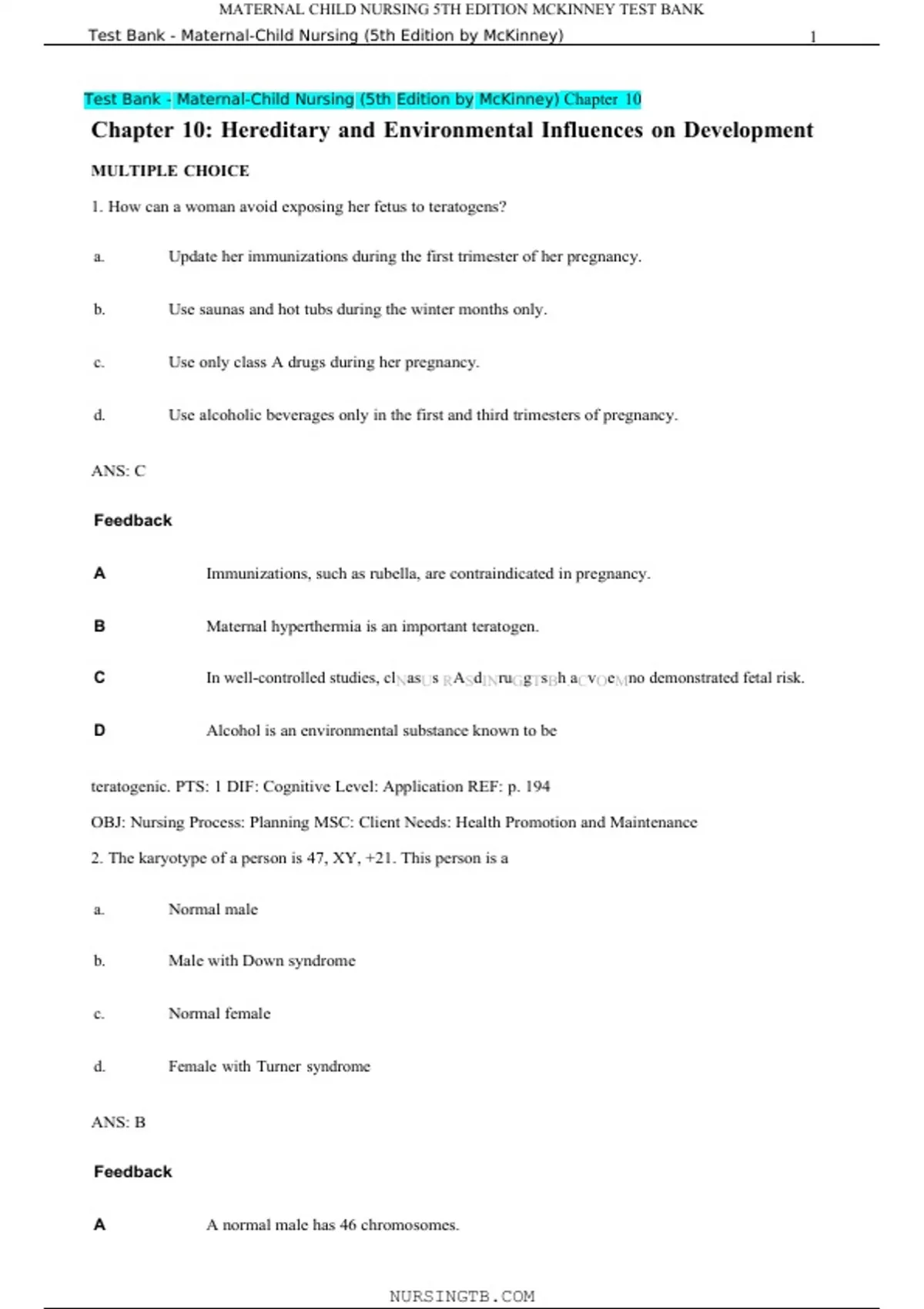 Test Bank - Maternal-Child Nursing (5th Edition by McKinney) Chapter 10 Chapter 10: Hereditary and Environmental Influences on Development MULTIPLE CHOICE 1. How can a woman avoid exposing her fetus to teratogens? a. Update her immunizations during the first trimester of her pregnancy. b. Use saunas and hot tubs during the winter months only. c. Use only class A drugs during her pregnancy. d. Use alcoholic beverages only in the first and third trimesters of pregnancy. ANS: C Feedback A Immunizations, such as rubella, are contraindicated in pregnancy. B Maternal hyperthermia is an important teratogen. C In well-controlled studies, clNasUs RASdINruGgTsBh.aCvOeMno demonstrated fetal risk. D Alcohol is an environmental substance known to be teratogenic. PTS: 1 DIF: Cognitive Level: Application REF: p. 194 OBJ: Nursing Process: Planning MSC: Client Needs: Health Promotion and Maintenance 2. The karyotype of a person is 47, XY, +21. This person is a a. Normal male b. Male with Down syndrome c. Normal female d. Female with Turner syndrome ANS: B Feedback A A normal male has 46 chromosomes. B This person is male because his sex chromosomes are XY. He has one extra copy of chromosome 21 (for a total of 47 instead of 46), resulting in Down syndrome. C A normal female has 46 chromosomes and XX for the sex chromosomes. D A female with Turner syndrome has 45 chromosomes; the sex chromosomes have just one X. PTS: 1 DIF: Cognitive Level: Comprehension REF: p. 191 OBJ: Nursing Process: Assessment MSC: Client Needs: Physiologic Integrity 3. People who have two copies of the same abnormal autosomal dominant gene will usually be a. More severely affected by the disorder than will people with one copy of the gene b. Infertile and unable to transmit the gene c. Carriers of the trait but not affected with the disorder d. Mildly affected with the disorder ANS: A Feedback NURSINGTB.COM A People who have two copies of an abnormal gene are usually more severely affected by the disorder because they have no normal gene to maintain normal function. B Infertility may or may not be caused by chromosomal defects. C A carrier of a trait has one recessive gene. D Those mildly affected with the disorder will have only one copy of the abnormal gene. PTS: 1 DIF: Cognitive Level: Comprehension REF: p. 191 OBJ: Nursing Process: Assessment MSC: Client Needs: Physiologic Integrity 4. A baby is born with blood type AB. The father is type A, and the mother is type B. The father asks why the baby has a blood type different from those of his parents. The nurses answer should be based on the knowledge that a. Both A and B blood types are dominant. b. The baby has a mutation of the parents blood types. c. Type A is recessive and links more easily with type B. d. Types A and B are recessive when linked together. ANS: A Feedback A Types A and B are equally dominant, and the baby can thus inherit one from each parent. B The infant has inherited both blood types from the parents; it is not a mutation. C Both types A and B are equally dominant. D Both types A and B are dominant. PTS: 1 DIF: Cognitive Level: Comprehension REF: p. 190 OBJ: Nursing Process: Implementation MSC: Client Needs: Physiologic Integrity 5. Which statement is true of multifactorial disorders? a. They may not be evident until lateNr iUnRliSfIeN. GTB.COM b. They are usually present and detectable at birth. c. The disorders are characterized by multiple defects. d. Secondary defects are rarely associated with multifactorial disease. ANS: B Feedback A They are usually detectable at birth. B Multifactorial disorders result from an interaction between a persons genetic susceptibility and environmental conditions that favor development of the defect. They are characteristically present and detectable at birth. C They are usually single isolated defects, although the primary defect may cause secondary defects. D Secondary defects can occur with multifactorial disorders. PTS: 1 DIF: Cognitive Level: Comprehension REF: p. 193 | Box 10-1 OBJ: Nursing Process: Assessment MSC: Client Needs: Health Promotion and Maintenance 6. Both members of an expectant couple are carriers for phenylketonuria (PKU), an autosomal recessive disorder. In counseling them about the risk to their unborn child, the nurse should tell them that a. The child has a 25% chance of being affected. b. The child will be a carrier, like the parents. c. The child has a 50% chance of being affected. d. One of four of their children will be affected. ANS: A Feedback A Each child born to a couple who carries an autosomal recessive trait has a 25% chance of having the disorder, because the child receives either a normal or an abnormal gene from each parent. B If one member of the coupleNhUasRtShIeNaGuTtoBs.oCmOaMl recessive disorder, all of their children will be carriers. If both parents are carriers, each child has a 50% chance of being a carrier. C The child has a 25% chance of being affected and a 50% chance of being a carrier. D Each child has the identical odds of being affected. Because both parents are carriers, each child has a 25% chance of being affected, a 50% change of being a carrier, and a 25% change of not having the gene transmitted. PTS: 1 DIF: Cognitive Level: Comprehension REF: pp. 190-191 | Box 10-1 OBJ: Nursing Process: Implementation MSC: Client Needs: Health Promotion and Maintenance 7. Which statement should a counselor make when telling a couple about the prenatal diagnosis of genetic disorders? a. Diagnosis can be obtained promptly through most hospital laboratories. b. Common disorders can quickly be diagnosed through blood tests. c. A comprehensive evaluation will result in an accurate diagnosis. d. Diagnosis may be slow and could be inconclusive.