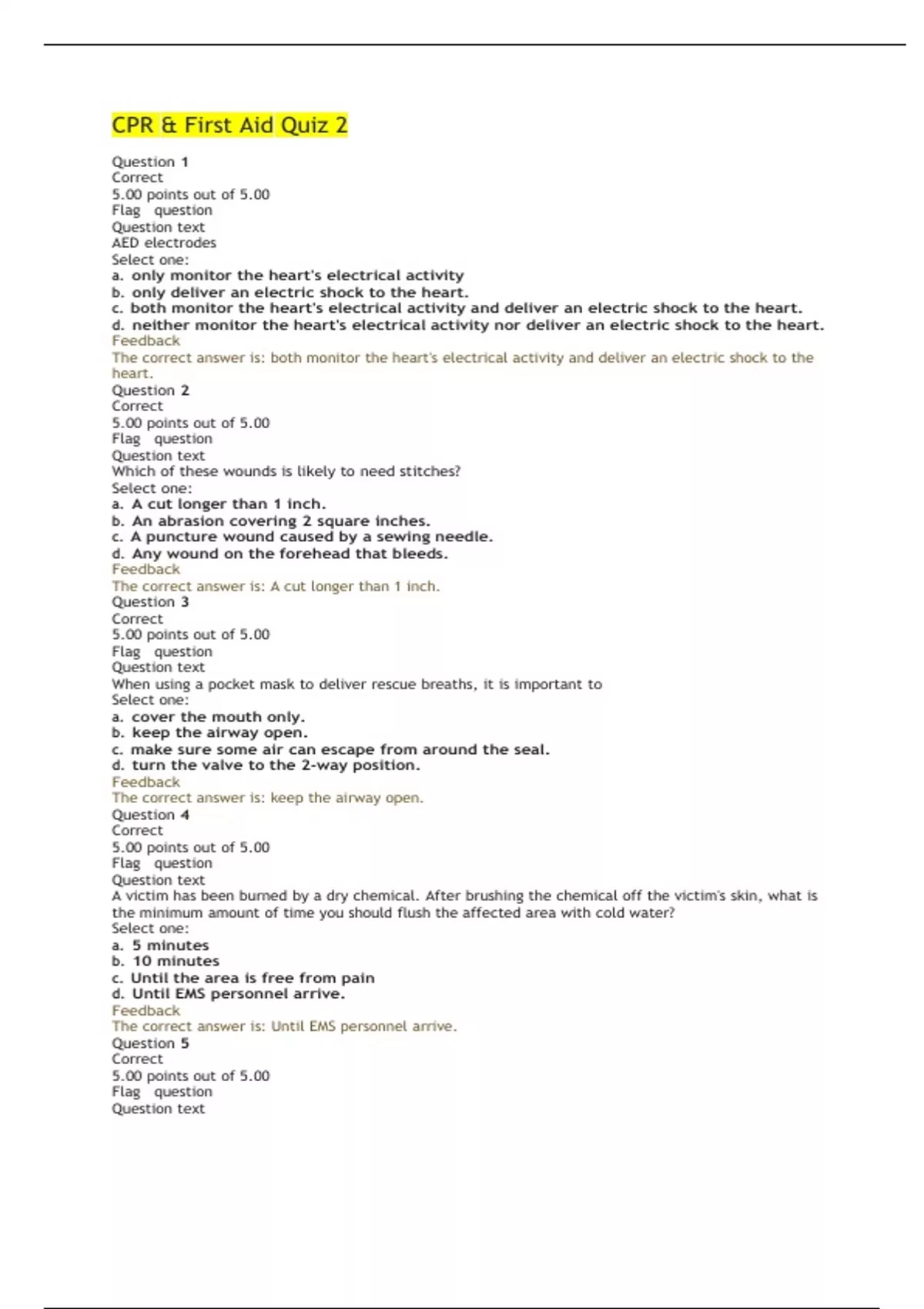 CPR & First Aid Quiz 2 Question 1 Correct 5.00 points out of 5.00 Flag question Question text AED electrodes Select one: a. only monitor the heart's electrical activity b. only deliver an electric shock to the heart. c. both monitor the heart's electrical activity and deliver an electric shock to the heart. d. neither monitor the heart's electrical activity nor deliver an electric shock to the heart. Feedback The correct answer is: both monitor the heart's electrical activity and deliver an electric shock to the heart. Question 2 Correct 5.00 points out of 5.00 Flag question Question text Which of these wounds is likely to need stitches? Select one: a. A cut longer than 1 inch. b. An abrasion covering 2 square inches. c. A puncture wound caused by a sewing needle. d. Any wound on the forehead that bleeds. Feedback The correct answer is: A cut longer than 1 inch. Question 3 Correct 5.00 points out of 5.00 Flag question Question text When using a pocket mask to deliver rescue breaths, it is important to Select one: a. cover the mouth only. b. keep the airway open. c. make sure some air can escape from around the seal. d. turn the valve to the 2-way position. Feedback The correct answer is: keep the airway open. Question 4 Correct 5.00 points out of 5.00 Flag question Question text A victim has been burned by a dry chemical. After brushing the chemical off the victim's skin, what is the minimum amount of time you should flush the affected area with cold water? Select one: a. 5 minutes b. 10 minutes c. Until the area is free from pain d. Until EMS personnel arrive. Feedback The correct answer is: Until EMS personnel arrive. Question 5 Correct 5.00 points out of 5.00 Flag question Question text You have determined that a victim has signs and symptoms of internal bleeding. What is your next step? Select one: a. Call 9-1-1. b. Help the victim lie on his or her back. c. Keep the victim from becoming chilled or overheated. d. Put a victim who vomits or becomes unresponsive in the recovery position. Feedback The correct answer is: Help the victim lie on his or her back. Question 6 Correct 5.00 points out of 5.00 Flag question Question text Adults can help prevent choking by Select one: a. chewing thoroughly. b. eating quickly. c. eating while engaged in other activities. d. talking while eating. Feedback The correct answer is: chewing thoroughly. Question 7 Correct 5.00 points out of 5.00 Flag question Question text If a victim is suffering from smoke inhalation, your first care step should be to Select one: a. call 9-1-1. b. encourage the victim to cough. c. get the victim to fresh air. d. help the victim into a position for easy breathing. Feedback The correct answer is: get the victim to fresh air. Question 8 Correct 5.00 points out of 5.00 Flag question Question text You are providing first aid to a victim with an apparent bruise on her leg. What is your first step in caring for the injury? Select one: a. Check for signs and symptoms of a fracture or sprain. b. Elevate the leg. c. Put ice or a cold pack on the area. d. Wrap the area with an elastic bandage. Feedback The correct answer is: Check for signs and symptoms of a fracture or sprain. Question 9 Correct 5.00 points out of 5.00 Flag question Question text You need to care for a minor wound. What is your first step? Select one: a. Apply an antibiotic ointment. b. Cover the wound with a sterile dressing and bandage. c. Gently wash the wound with running water to remove dirt. d. Pat the area dry. Feedback