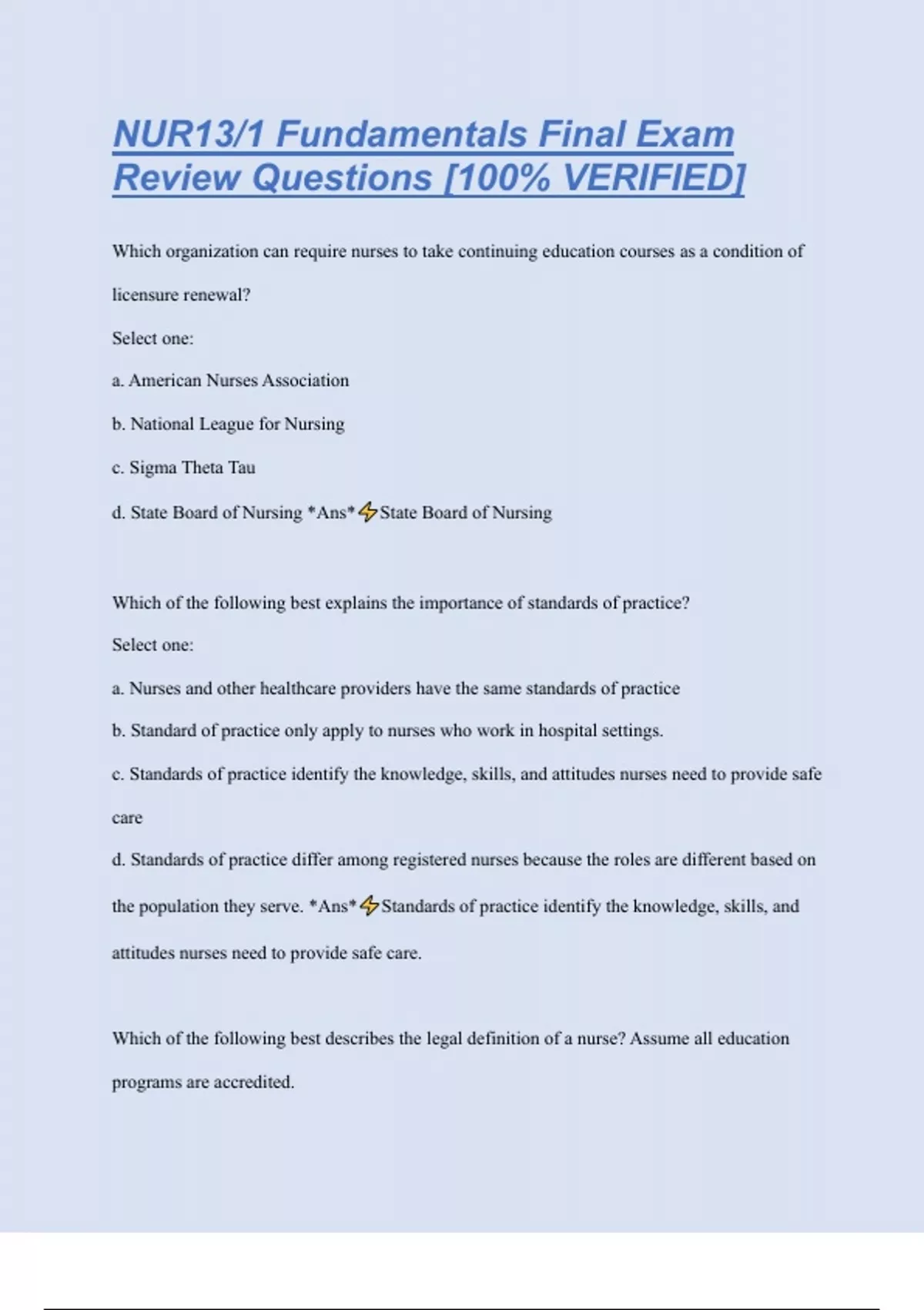 NUR13/1 Fundamentals Final Exam Review Questions [100% VERIFIED] Which organization can require nurses to take continuing education courses as a condition of licensure renewal? Select one: a. American Nurses Association b. National League for Nursing c. Sigma Theta Tau d. State Board of Nursing *Ans* State Board of Nursing Which of the following best explains the importance of standards of practice? Select one: a. Nurses and other healthcare providers have the same standards of practice b. Standard of practice only apply to nurses who work in hospital settings. c. Standards of practice identify the knowledge, skills, and attitudes nurses need to provide safe care d. Standards of practice differ among registered nurses because the roles are different based on the population they serve. *Ans* Standards of practice identify the knowledge, skills, and attitudes nurses need to provide safe care. Which of the following best describes the legal definition of a nurse? Assume all education programs are accredited. Select one: a. Graduate of a nursing education program and has passed the National Council Licensure Exam b. Person with advanced training and certified to administer medications in most healthcare settings c. Graduate licensed to practice in an acute care setting or a home care environment d. Graduate with advanced education licensed to practice under the direct supervision of a physician *Ans* Graduate of a nursing education program and has passed the National Council Licensure Exam (NCLEX) A patient who is being discharged asks the nurse, "Can I take you out for dinner to show my appreciation for all that you have done for me? I really like you." The nurse's best response is which of the following? Select one: a. "Yes, that would be nice. It is really great to be appreciated." b. "No, and please do not ask again. You should have been told that already." c. "Thank you; however, I have to refuse, even though the thought is appreciated." d. "We will have to wait 3 days after you have been discharged to have a relationship." *Ans* Thank you; however, I have to refuse, even though the thought is appreciated. Which of the following concepts refers to conflicts that arise between two or more ethical
