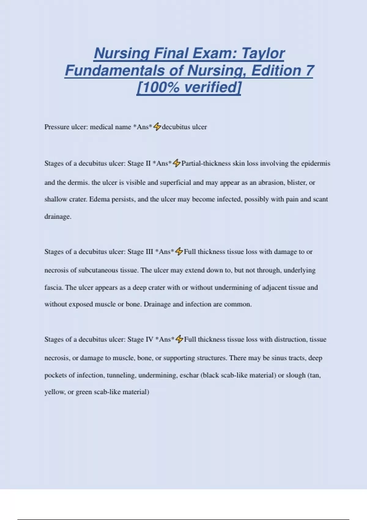 Nursing Final Exam: Taylor Fundamentals of Nursing, Edition 7 [100% verified] Pressure ulcer: medical name *Ans* decubitus ulcer Stages of a decubitus ulcer: Stage II *Ans* Partial-thickness skin loss involving the epidermis and the dermis. the ulcer is visible and superficial and may appear as an abrasion, blister, or shallow crater. Edema persists, and the ulcer may become infected, possibly with pain and scant drainage. Stages of a decubitus ulcer: Stage III *Ans* Full thickness tissue loss with damage to or necrosis of subcutaneous tissue. The ulcer may extend down to, but not through, underlying fascia. The ulcer appears as a deep crater with or without undermining of adjacent tissue and without exposed muscle or bone. Drainage and infection are common. Stages of a decubitus ulcer: Stage IV *Ans* Full thickness tissue loss with distruction, tissue necrosis, or damage to muscle, bone, or supporting structures. There may be sinus tracts, deep pockets of infection, tunneling, undermining, eschar (black scab-like material) or slough (tan, yellow, or green scab-like material) Stages of a decubitus ulcer: Unstageable *Ans* Ulcers whose stage cannot be determined because eschar or slough obscures the wound Stages of wound healing *Ans* 1. Inflammatory (initial) -immediate phase, lasts about 3 days -increased blood supply and phagocytosis (delivers oxygen, wbcs, and nutrient to the wound to support healing) -control bleeding for clot formation 2. Proliferative (granulation) -second phase -fibroblasts synthesize collagen -formation of granulation tissue 3. Maturation and Remodeling -continued granulation and strengthening of tissue -scar formation Factor that affect wound healing *Ans* Factors that affect wound healing include: age, loss of skin turgor, skin fragility, decreased peripheral circulation and oxygenation, slower tissue regeneration, malnutrition, decreased collagen, immune sys. impairment, medications, obesity, stress, smoking, and wound stress, among others. Principles of wound care: (3 answers) *Ans* Assessmen