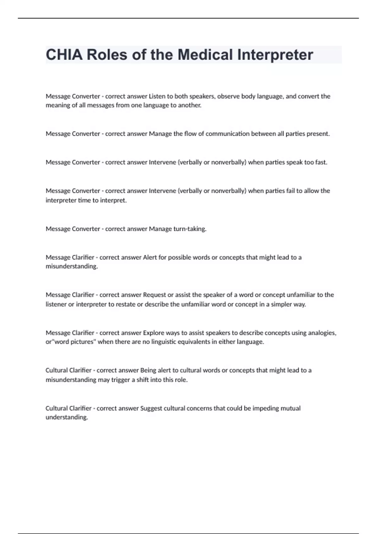 CHIA Roles of the Medical Interpreter correctly answered graded A+