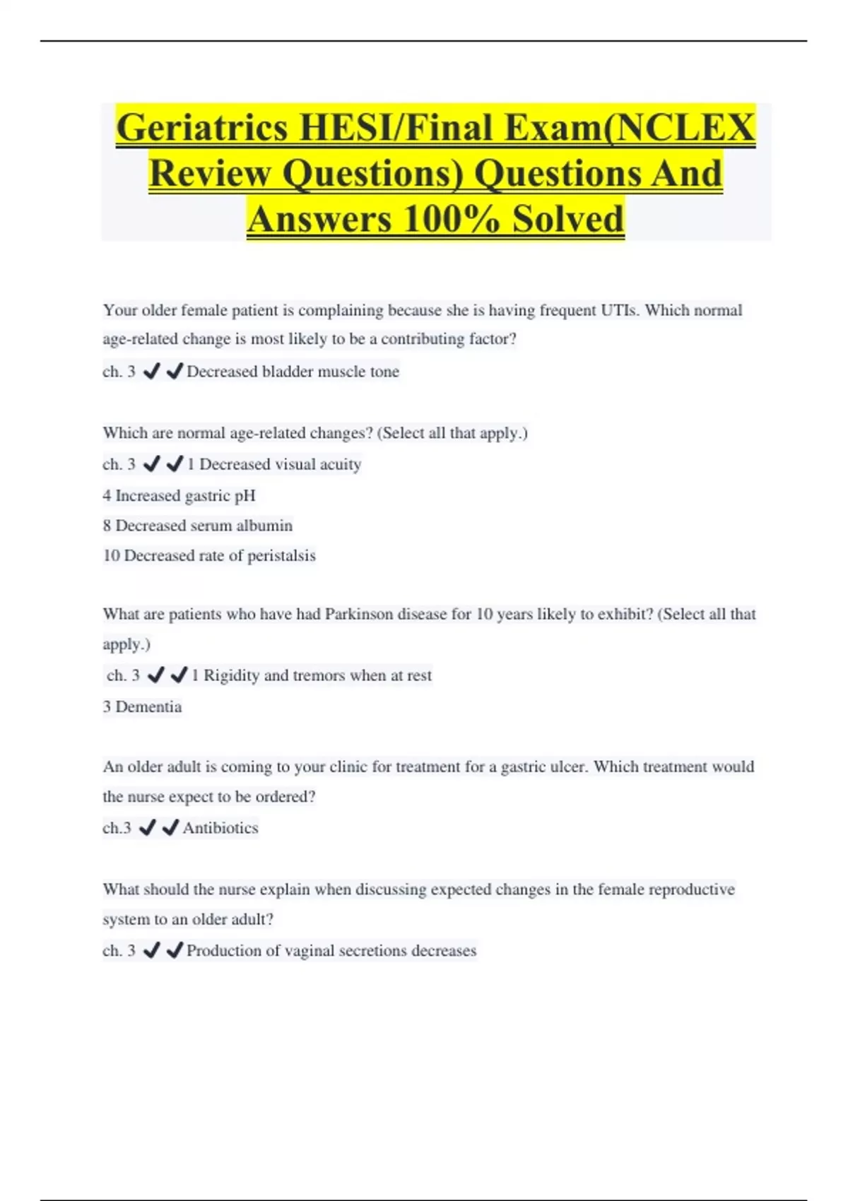 Geriatrics HESI/Final Exam(NCLEX Review Questions) Questions And Answers 100% Solved Your older female patient is complaining because she is having frequent UTIs. Which normal age-related change is most likely to be a contributing factor? ch. 3 ️️Decreased bladder muscle tone Which are normal age-related changes? (Select all that apply.) ch. 3 ️️1 Decreased visual acuity 4 Increased gastric pH 8 Decreased serum albumin 10 Decreased rate of peristalsis What are patients who have had Parkinson disease for 10 years likely to exhibit? (Select all that apply.) ch. 3 ️️1 Rigidity and tremors when at rest 3 Dementia An older adult is coming to your clinic for treatment for a gastric ulcer. Which treatment would the nurse expect to be ordered? ch.3 ️️Antibiotics What should the nurse explain when discussing expected changes in the female reproductive system to an older adult? ch. 3 ️️Production of vaginal secretions decreases