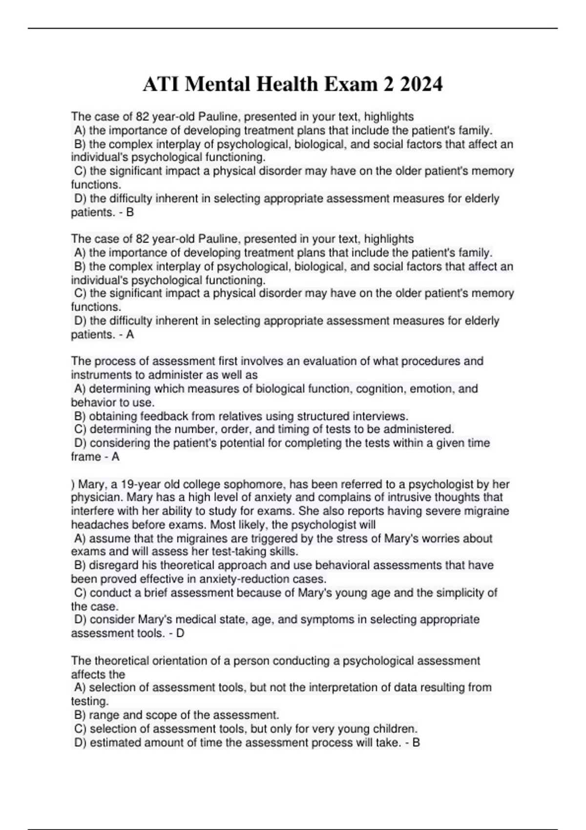 The case of 82 year-old Pauline, presented in your text, highlights A) the importance of developing treatment plans that include the patient's family. B) the complex interplay of psychological, biological, and social factors that affect an individual's psychological functioning. C) the significant impact a physical disorder may have on the older patient's memory functions. D) the difficulty inherent in selecting appropriate assessment measures for elderly patients. - B The case of 82 year-old Pauline, presented in your text, highlights A) the importance of developing treatment plans that include the patient's family. B) the complex interplay of psychological, biological, and social factors that affect an individual's psychological functioning. C) the significant impact a physical disorder may have on the older patient's memory functions. D) the difficulty inherent in selecting appropriate assessment measures for elderly patients. - A The process of assessment first involves an evaluation of what procedures and instruments to administer as well as A) determining which measures of biological function, cognition, emotion, and behavior to use. B) obtaining feedback from relatives using structured interviews. C) determining the number, order, and timing of tests to be administered. D) considering the patient's potential for completing the tests within a given time frame - A ) Mary, a 19-year old college sophomore, has been referred to a psychologist by her physician. Mary has a high level of anxiety and complains of intrusive thoughts that interfere with her ability to study for exams. She also reports having severe migraine headaches before exams. Most likely, the psychologist will A) assume that the migraines are triggered by the stress of Mary's worries about exams and will assess her test-taking skills. B) disregard his theoretical approach and use behavioral assessments that have been proved effective in anxiety-reduction cases. C) conduct a brief assessment because of Mary's young age and the simplicity of the case. D) consider Mary's medical state, age, and symptoms in selecting appropriate assessment tools. - D The theoretical orientation of a person conducting a psychological assessment affects the A) selection of assessment tools, but not the interpretation of data resulting from testing. B) range and scope of the assessment. C) selection of assessment tools, but only for very young children. D) estimated amount of time the assessment process will take. - B Miguel is a 24-year-old married man who was referred by his physician to a psychologist for assessment. In order for the psychologist to release information to Miguel's doctor, A) the psychologist would want to ensure that the information is accurate and reviewed by Miguel before it is released. B) the psychologist would want to clear the release with Miguel's wife for legal reasons. C) Miguel would have to provide permission for the release of information to his doctor. D) Miguel would waive his right to confidentiality since his physician made the original referral and the assessment is part of his medical record. - C During the college's health fair, the Counseling Center offers confidential testing to evaluate a student's risk for substance abuse. According to your text, this assessment process is typically known as a A) prospective evaluation. B) screening. C) differential risk measurement. D) risk evaluation - B ) A community screening for depression might identify A) people at risk for depression if they are not treated. B) the people in a cohort who might benefit from a particular type of therapy. C) the number of people likely to recover without any psychological treatment. D) what a specific cohort's cut-off score should be, considering all risk factors. - A