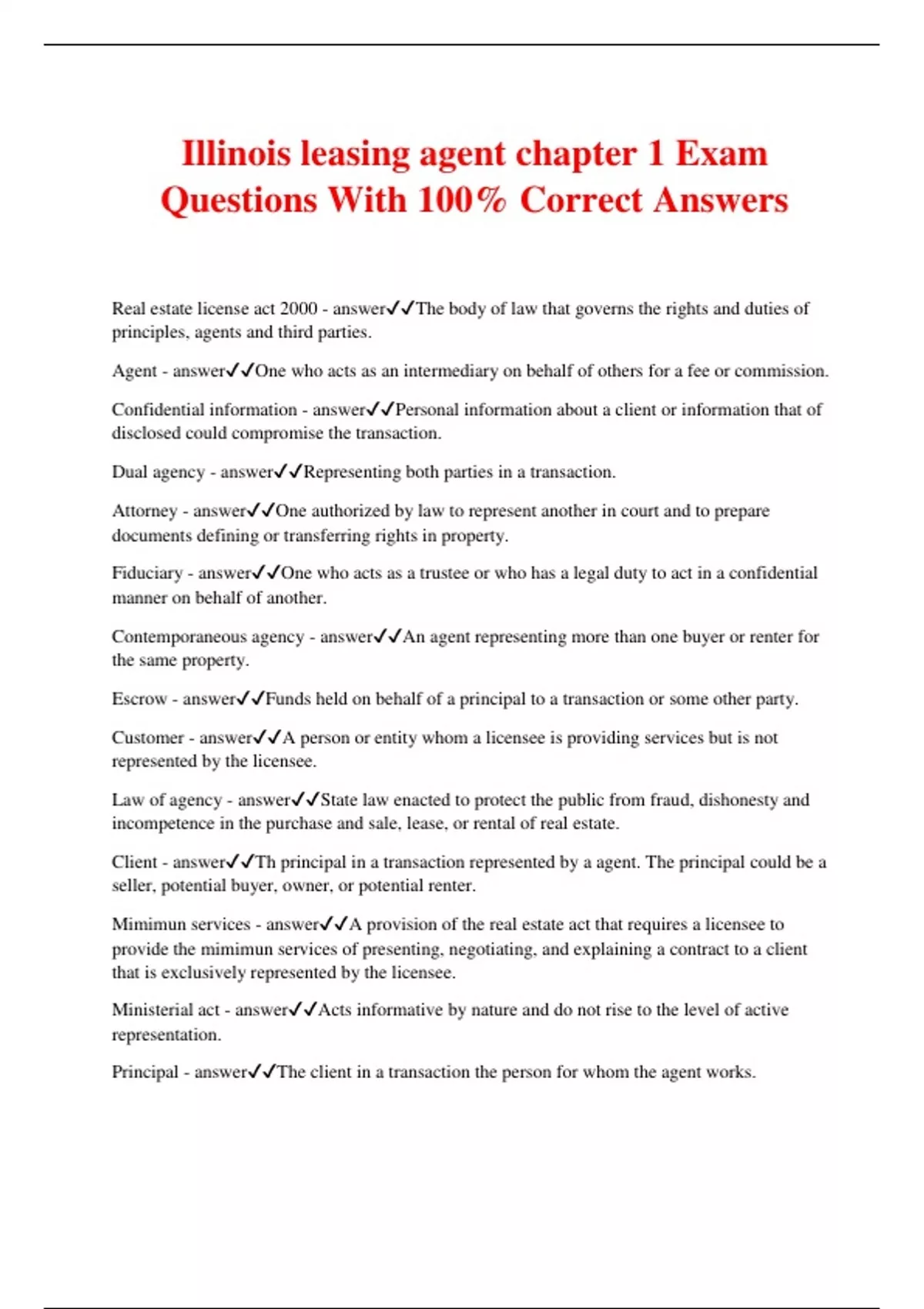 Illinois leasing agent chapter 1 Exam Questions With 100% Correct Answers Real estate license act 2000 - answerThe body of law that governs the rights and duties of principles, agents and third parties. Agent - answerOne who acts as an intermediary on behalf of others for a fee or commission. Confidential information - answerPersonal information about a client or information that of disclosed could compromise the transaction. Dual agency - answerRepresenting both parties in a transaction. Attorney - answerOne authorized by law to represent another in court and to prepare documents defining or transferring rights in property. Fiduciary - answerOne who acts as a trustee or who has a legal duty to act in a confidential manner on behalf of another. Contemporaneous agency - answerAn agent representing more than one buyer or renter for the same property. Escrow - answerFunds held on behalf of a principal to a transaction or some other party. Customer - answerA person or entity whom a licensee is providing services but is not represented by the licensee. Law of agency - answerState law enacted to protect the public from fraud, dishonesty and incompetence in the purchase and sale, lease, or rental of real estate. Client - answerTh principal in a transaction represented by a agent. The principal could be a seller, potential buyer, owner, or potential renter. Mimimun services - answerA provision of the real estate act that requires a licensee to provide the mimimun services of presenting, negotiating, and explaining a contract to a client that is exclusively represented by the licensee. Ministerial act - answerActs informative by nature and do not rise to the level of active representation. Principal - answerThe client in a transaction the person for whom the agent works.