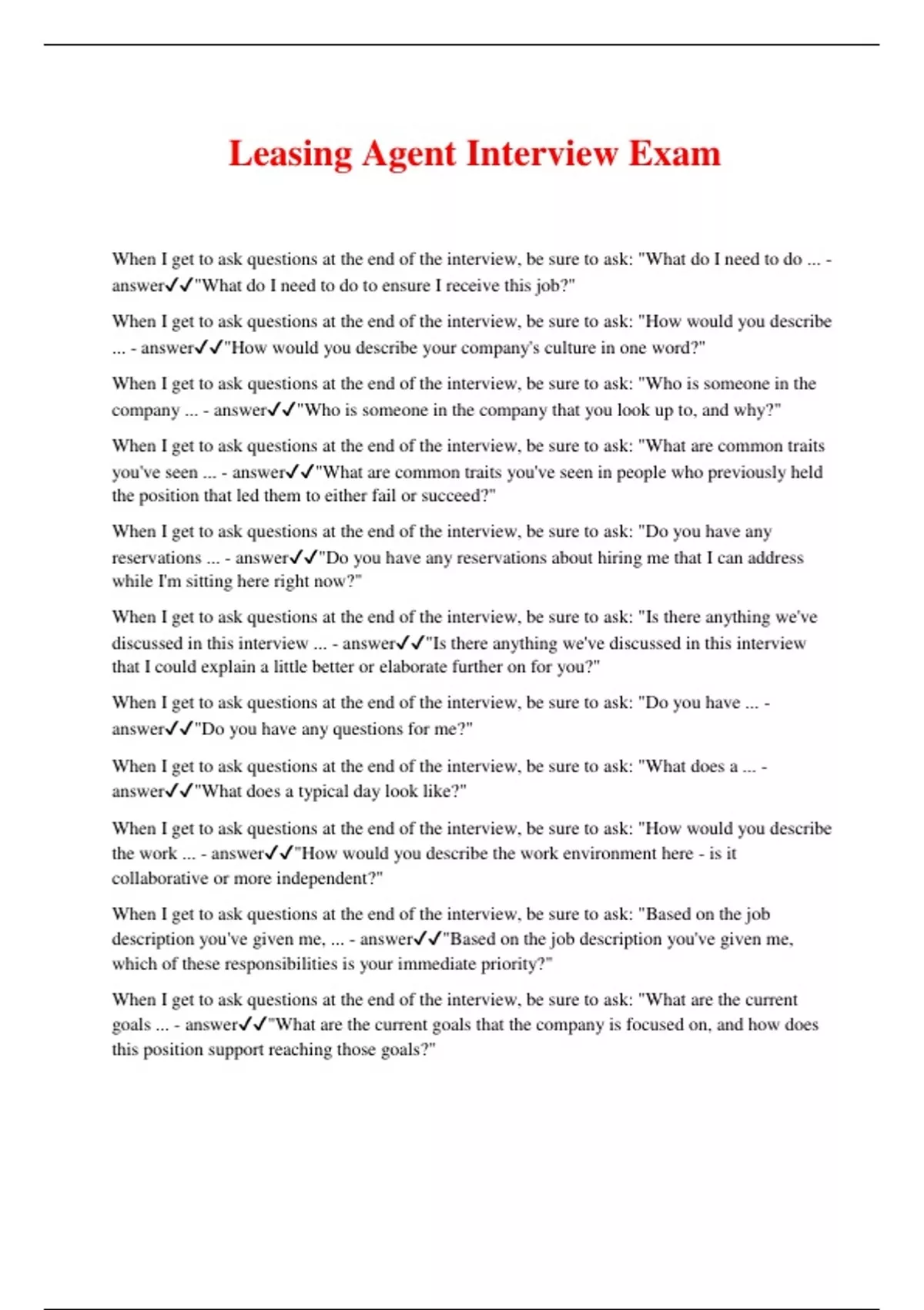 Leasing Agent Interview Exam When I get to ask questions at the end of the interview, be sure to ask: "What do I need to do ... - answer"What do I need to do to ensure I receive this job?" When I get to ask questions at the end of the interview, be sure to ask: "How would you describe ... - answer"How would you describe your company's culture in one word?" When I get to ask questions at the end of the interview, be sure to ask: "Who is someone in the company ... - answer"Who is someone in the company that you look up to, and why?" When I get to ask questions at the end of the interview, be sure to ask: "What are common traits you've seen ... - answer"What are common traits you've seen in people who previously held the position that led them to either fail or succeed?" When I get to ask questions at the end of the interview, be sure to ask: "Do you have any reservations ... - answer"Do you have any reservations about hiring me that I can address while I'm sitting here right now?" When I get to ask questions at the end of the interview, be sure to ask: "Is there anything we've discussed in this interview ... - answer"Is there anything we've discussed in this interview that I could explain a little better or elaborate further on for you?" When I get to ask questions at the end of the interview, be sure to ask: "Do you have ... - answer"Do you have any questions for me?" When I get to ask questions at the end of the interview, be sure to ask: "What does a ... - answer"What does a typical day look like?" When I get to ask questions at the end of the interview, be sure to ask: "How would you describe the work ... - answer"How would you describe the work environment here - is it collaborative or more independent?" When I get to ask questions at the end of the interview, be sure to ask: "Based on the job description you've given me, ... - answer"Based on the job description you've given me, which of these responsibilities is your immediate priority?" When I get to ask questions at the end of the interview, be sure to ask: "What are the current goals ... - answer"What are the current goals that the company is focused on, and how does this position support reaching those goals?"