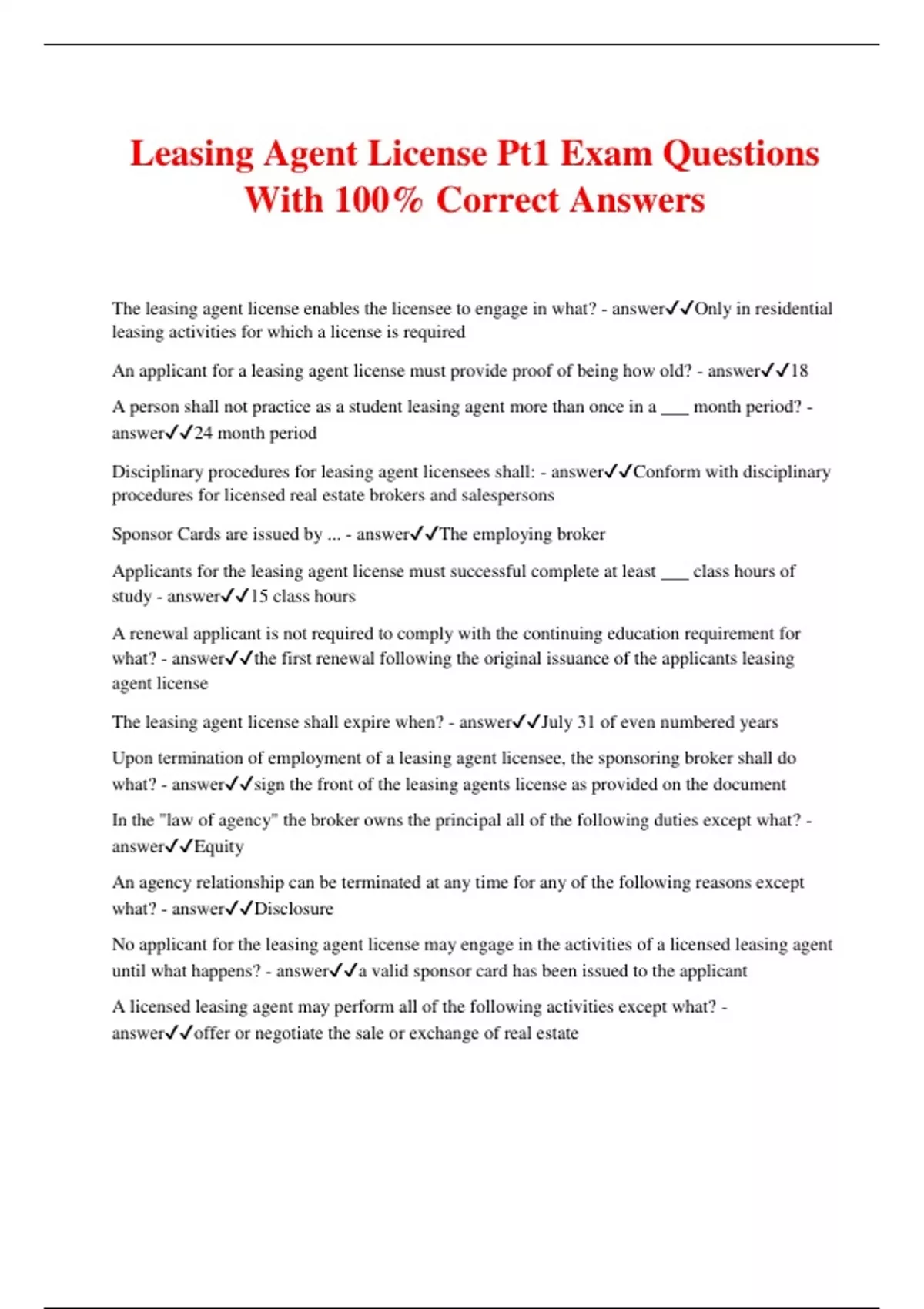 Leasing Agent License Pt1 Exam Questions With 100% Correct Answers The leasing agent license enables the licensee to engage in what? - answerOnly in residential leasing activities for which a license is required An applicant for a leasing agent license must provide proof of being how old? - answer18 A person shall not practice as a student leasing agent more than once in a ___ month period? - answer24 month period Disciplinary procedures for leasing agent licensees shall: - answerConform with disciplinary procedures for licensed real estate brokers and salespersons Sponsor Cards are issued by ... - answerThe employing broker Applicants for the leasing agent license must successful complete at least ___ class hours of study - answer15 class hours A renewal applicant is not required to comply with the continuing education requirement for what? - answerthe first renewal following the original issuance of the applicants leasing agent license The leasing agent license shall expire when? - answerJuly 31 of even numbered years Upon termination of employment of a leasing agent licensee, the sponsoring broker shall do what? - answersign the front of the leasing agents license as provided on the document In the "law of agency" the broker owns the principal all of the following duties except what? - answerEquity An agency relationship can be terminated at any time for any of the following reasons except what? - answerDisclosure No applicant for the leasing agent license may engage in the activities of a licensed leasing agent until what happens? - answera valid sponsor card has been issued to the applicant A licensed leasing agent may perform all of the following activities except what? - answeroffer or negotiate the sale or exchange of real estate