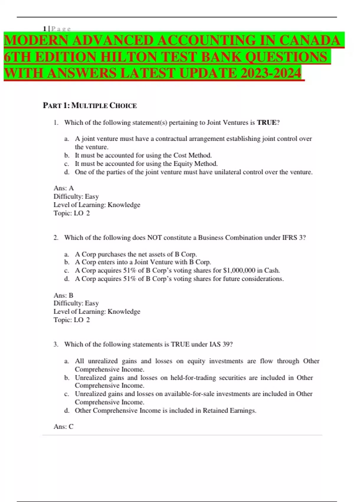 MODERN ADVANCED ACCOUNTING IN CANADA 6TH EDITION HILTON TEST BANK QUESTIONS WITH ANSWERS LATEST UPDATE PART 1: MULTIPLE CHOICE 1. Which of the following statement(s) pertaining to Joint Ventures is TRUE? a. A joint venture must have a contractual arrangement establishing joint control over the venture. b. It must be accounted for using the Cost Method. c. It must be accounted for using the Equity Method. d. One of the parties of the joint venture must have unilateral control over the venture. Ans: A Difficulty: Easy Level of Learning: Knowledge Topic: LO 2 2. Which of the following does NOT constitute a Business Combination under IFRS 3? a. A Corp purchases the net assets of B Corp. b. A Corp enters into a Joint Venture with B Corp. c. A Corp acquires 51% of B Corp’s voting shares for $1,000,000 in Cash. d. A Corp acquires 51% of B Corp’s voting shares for future considerations. Ans: B Difficulty: Easy Level of Learning: Knowledge Topic: LO 2 3. Which of the following statements is TRUE under IAS 39? a. All unrealized gains and losses on equity investments are flow through Other Comprehensive Income. b. Unrealized gains and losses on held-for-trading securities are included in Other Comprehensive Income. c. Unrealized gains and losses on available-for-sale investments are included in Other Comprehensive Income. d. Other Comprehensive Income is included in Retained Earnings. Ans: C Difficulty: Easy Level of Learning: Knowledge Topic: LO 4 4. Which of the following statements is CORRECT? 1 | P a g e a. A Comprehensive Revaluation of Assets and Liabilities is mandatory when there has been a change in control. b. A Comprehensive Revaluation of Assets and Liabilities is optional when there has been a change in control. c. A Comprehensive Revaluation of Assets and Liabilities is optional when the company was subject to a Financial Reorganization. d. A Comprehensive Revaluation of Assets and Liabilities is mandatory when there has been a change in control and/or the company has been subject to a Financial Reorganization. Ans: B Difficulty: Moderate Level of Learning: Knowledge Topic: LO 2 5. Under which of the following scenarios would Foreign Currency translation of an Associate NOT be required? a. The Associate is located in a different country. b. The Associate prepares its financial statements in a foreign currency. c. The investing Company has borrowings denominated in a Foreign Currency. d. The Associate prepares its financial statements using the same currency as the Investing Company. Ans: D Difficulty: Easy Level of Learning: Knowledge Topic: LO 4 6. Since its inception Company X has had earnings of $800,000 and paid out dividends of $900,000. Which of the following statements is correct with respect to Company X? a. The Company has been subject to a hostile takeover. b. The Company’s share price will likely increase when investors become aware of this. c. A liquidating dividend has occurred. d. Company X’s total Shareholder Equity has increased since its inception. Ans: C Difficulty: Easy Level of Learning: Knowledge Topic: LO 4 7. Private enterprise gap is permitted in certain instances for: a. all privately held companies. b. all publicly held companies. c. all Canadian companies. d. Canadian companies consolidating its foreign subsidiaries. Ans: A Difficulty: Easy Level of Learning: Knowledge Topic: LO 2 8. Which of the following types of share investment does not qualify as a strategic investment? a. Significant influence investments. b. Joint Control investments. c. Held for Trading. d. Control investments. Ans: C Difficulty: Easy Level of Learning: Knowledge Topic: LO 2 9. What percentage of ownership is used as a guideline to determine that significant influence exists under IAS 28? a. 20% or less. b. Less than 20%. c. Between 20% and 50%. d. 25% or more. Ans: C Difficulty: Easy Level of Learning: Knowledge Topic: LO 3 10. Gains and losses on fair-value-through-profit-or-loss securities: a. are included in net income, regardless of whether they are realized or not. b. are included in net income only when the investment has become permanently impaired.