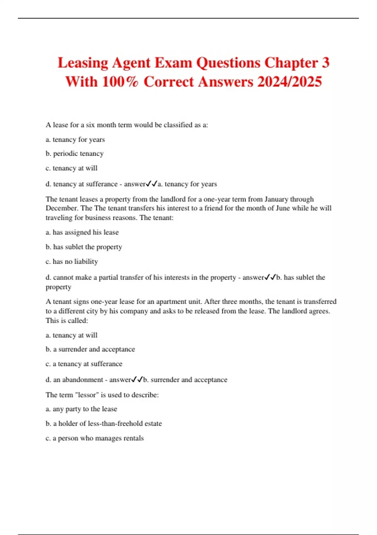 Leasing Agent Exam Questions Chapter 3 With 100% Correct Answers 2024/2025 A lease for a six month term would be classified as a: a. tenancy for years b. periodic tenancy c. tenancy at will d. tenancy at sufferance - answera. tenancy for years The tenant leases a property from the landlord for a one-year term from January through December. The The tenant transfers his interest to a friend for the month of June while he will traveling for business reasons. The tenant: a. has assigned his lease b. has sublet the property c. has no liability d. cannot make a partial transfer of his interests in the property - answerb. has sublet the property A tenant signs one-year lease for an apartment unit. After three months, the tenant is transferred to a different city by his company and asks to be released from the lease. The landlord agrees. This is called: a. tenancy at will b. a surrender and acceptance c. a tenancy at sufferance d. an abandonment - answerb. surrender and acceptance The term "lessor" is used to describe: a. any party to the lease b. a holder of less-than-freehold estate c. a person who manages rentals