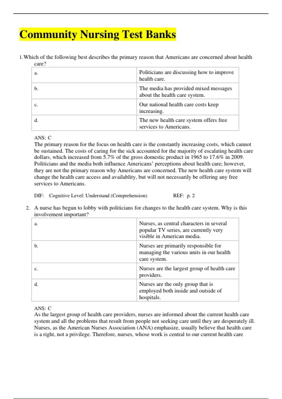 Community Nursing Test Banks 1. Which of the following best describes the primary reason that Americans are concerned about health care? a. Politicians are discussing how to improve health care. b. The media has provided mixed messages about the health care system. c. Our national health care costs keep increasing. d. The new health care system offers free services to Americans. ANS: C The primary reason for the focus on health care is the constantly increasing costs, which cannot be sustained. The costs of caring for the sick accounted for the majority of escalating health care dollars, which increased from 5.7% of the gross domestic product in 1965 to 17.6% in 2009. Politicians and the media both influence Americans’ perceptions about health care; however, they are not the primary reason why Americans are concerned. The new health care system will change the health care access and availablity, but will not necessarily be offering any free services to Americans. DIF: Cognitive Level: Understand (Comprehension) REF: p. 2 2. A nurse has begun to lobby with politicians for changes to the health care system. Why is this involvement important? a. Nurses, as central characters in several popular TV series, are currently very visible in American media. b. Nurses are primarily responsible for managing the various units in our health care system. c. Nurses are the largest group of health care providers. d. Nurses are the only group that is employed both inside and outside of hospitals. ANS: C As the largest group of health care providers, nurses are informed about the current health care system and all the problems that result from people not seeking care until they are desperately ill. Nurses, as the American Nurses Association (ANA) emphasize, usually believe that health care is a right, not a privilege. Therefore, nurses, whose work is central to our current health care delivery system, can also be instrumental in working politically to create a health care delivery system that will meet health needs. While nurses are in several current TV series and are employed both inside and outside of hospitals, physicians and other health care providers are as well. Nurses are often managers, but managers often have other backgrounds, such as business administration. DIF: Cognitive Level: Understand (Comprehension) REF: p. 2 3. What conclusion can be drawn from examining where nurses are employed? a. There is a trend toward consolidation of health care into large central medical centers. b. There is an increased emphasis on community-based health care. c. There is an obvious need to decrease health care costs by cutting positions. d. Managed care organizations (MCOs) are employing nurses to improve customer relations. ANS: B MCOs are employing nurses in many capacities. Although hospitals are closing and acute care is increasingly found in central medical centers, the same trend may be seen in an increase in neighborhood-based practice centers. While positions are cut in most industries, health care is recognized as an area where growth in employment is expected. However, nurses are increasingly employed in community settings as opposed to hospitals. This change reflects the move toward community-based care rather than hospital-based tertiary care. To help decrease the continued rise in health care costs, the increased emphasis is on disease prevention rather than high-cost treatment. DIF: Cognitive Level: Understand (Comprehension) REF: p. 2 4. Which ethical belief would be most helpful in the current health care crisis? a. Emphasis should be on individual and corporation freedom in the marketplace. b. Emphasis should be on individual autonomy and freedom of choice. c. Emphasis should be on social justice and collective responsibility. d. Emphasis should be on the effectiveness of technology in resolving problems. ANS: C Public health recognizes the necessity of collective action in keeping the environment safe and in egalitarian tradition and vision. An overinvestment in technology and seeking of cures within the market justice system has stifled the evolution of a health system to protect and preserve the health of the population. Although individual autonomy and freedom of choice are important, so is the recognition of collective responsibility in ensuring social justice, which entitles all people to basic necessities. DIF: Cognitive Level: Apply (Application) REF: p. 2 5. What is the primary problem seen in Healthy People 2020’s emphasis on choosing healthy lifestyle behaviors, such as daily exercise or healthy food choices? a. Emphasis on other lifestyle choices, such as not smoking and minimal use of alcohol or drugs, is also needed. b. All of us must work together to make unhealthy behaviors socially unacceptable. c. It costs more to make healthy choices, such as buying and eating fresh fruits and vegetables as opposed to quick and cheap fast-food choices. d. Public policy emphasizes personal responsibility but ignores social and environmental changes needed for well- being. ANS: D Although all responses are accurate, the primary problem is the emphasis on personal choices in the Healthy People 2020 objectives. Emphasis on personal choices ignores the need for community responsibility and action that addresses environmental or cultural restraints to health. DIF: Cognitive Level: Apply (Application) REF: p. 2 6. What responsibility does the American Nurses Association (ANA) Code of Ethics require of the nurse beyond giving excellent care to patients? a. Accept longer work schedules to ensure that professional care is always available to clients b. Recognize the need for experienced nurses to mentor new graduates to help increase and expand the number of professionals available c. Support health legislation to improve accessibility and cost of health care d. Volunteer to work overtime as needed to ensure maximum quality of care ANS: C The ANA Code of Ethics promotes social reform by focusing o