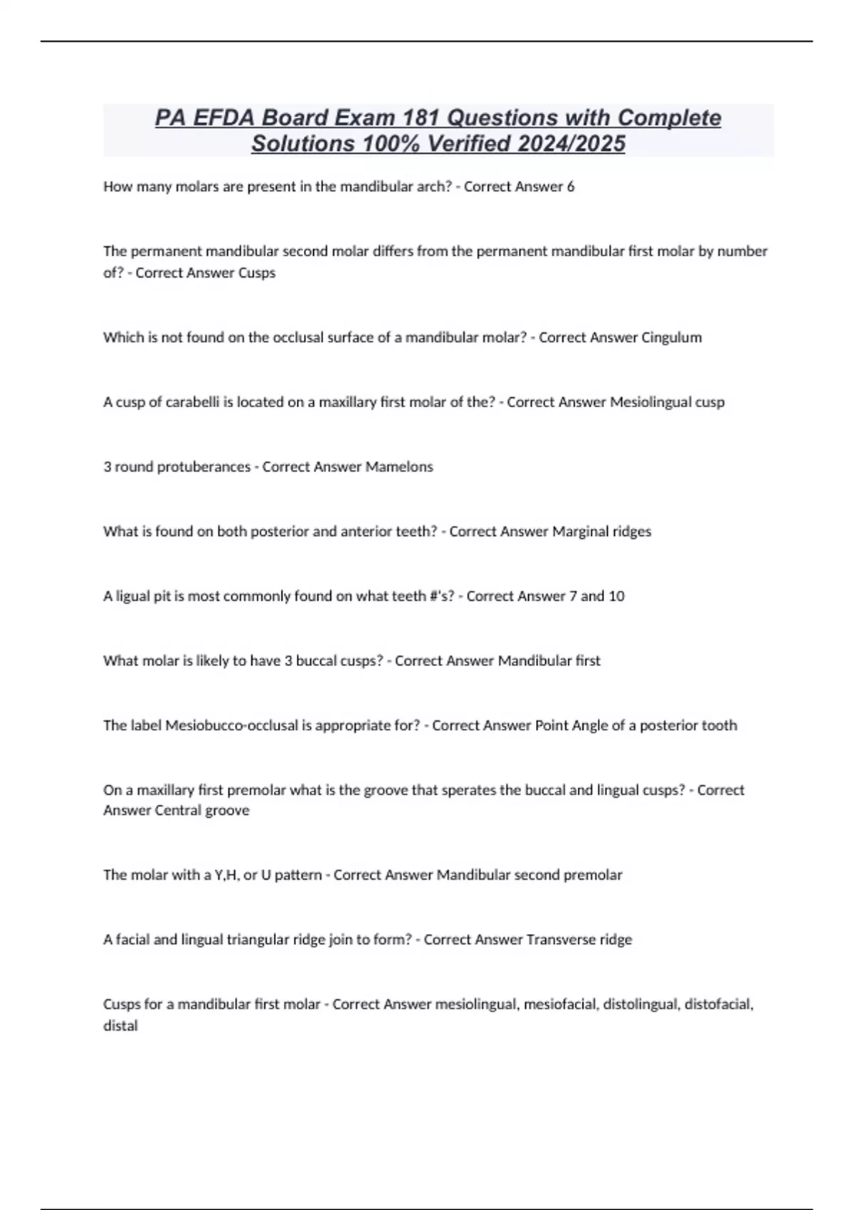 PA EFDA Board Exam 181 Questions with Complete Solutions 100% Verified 2024/2025 How many molars are present in the mandibular arch? - Correct Answer 6 The permanent mandibular second molar differs from the permanent mandibular first molar by number of? - Correct Answer Cusps Which is not found on the occlusal surface of a mandibular molar? - Correct Answer Cingulum A cusp of carabelli is located on a maxillary first molar of the? - Correct Answer Mesiolingual cusp 3 round protuberances - Correct Answer Mamelons What is found on both posterior and anterior teeth? - Correct Answer Marginal ridges A ligual pit is most commonly found on what teeth #'s? - Correct Answer 7 and 10 What molar is likely to have 3 buccal cusps? - Correct Answer Mandibular first The label Mesiobucco-occlusal is appropriate for? - Correct Answer Point Angle of a posterior tooth On a maxillary first premolar what is the groove that sperates the buccal and lingual cusps? - Correct Answer Central groove The molar with a Y,H, or U pattern - Correct Answer Mandibular second premolar A facial and lingual triangular ridge join to form? - Correct Answer Transverse ridge Cusps for a mandibular first molar - Correct Answer mesiolingual, mesiofacial, distolingual, distofacial, distal