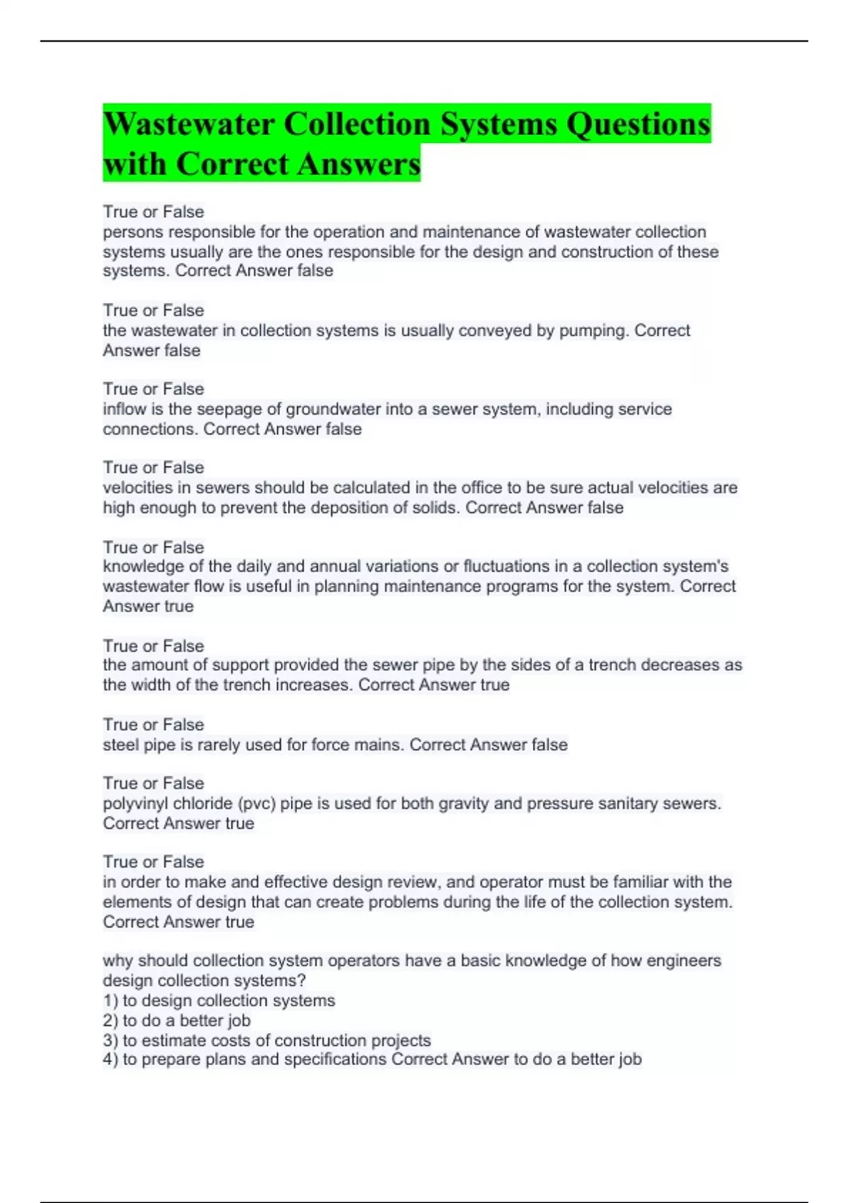 True or False persons responsible for the operation and maintenance of wastewater collection systems usually are the ones responsible for the design and construction of these systems. Correct Answer false True or False the wastewater in collection systems is usually conveyed by pumping. Correct Answer false True or False inflow is the seepage of groundwater into a sewer system, including service connections. Correct Answer false True or False velocities in sewers should be calculated in the office to be sure actual velocities are high enough to prevent the deposition of solids. Correct Answer false True or False knowledge of the daily and annual variations or fluctuations in a collection system's wastewater flow is useful in planning maintenance programs for the system. Correct Answer true True or False the amount of support provided the sewer pipe by the sides of a trench decreases as the width of the trench increases. Correct Answer true True or False steel pipe is rarely used for force mains. Correct Answer false True or False polyvinyl chloride (pvc) pipe is used for both gravity and pressure sanitary sewers. Correct Answer true True or False in order to make and effective design review, and operator must be familiar with the elements of design that can create problems during the life of the collection system. Correct Answer true why should collection system operators have a basic knowledge of how engineers design collection systems? 1) to design collection systems 2) to do a better job 3) to estimate costs of construction projects 4) to prepare plans and specifications Correct Answer to do a better job