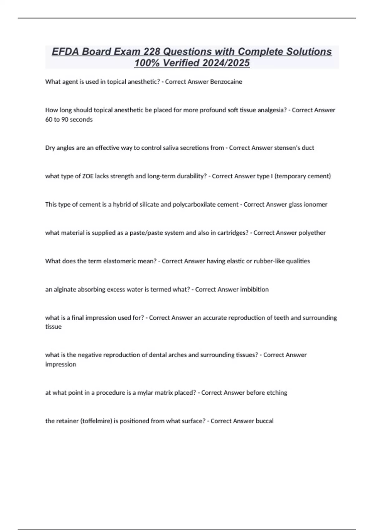 EFDA Board Exam 228 Questions with Complete Solutions 100% Verified 2024/2025 What agent is used in topical anesthetic? - Correct Answer Benzocaine How long should topical anesthetic be placed for more profound soft tissue analgesia? - Correct Answer 60 to 90 seconds Dry angles are an effective way to control saliva secretions from - Correct Answer stensen's duct what type of ZOE lacks strength and long-term durability? - Correct Answer type I (temporary cement) This type of cement is a hybrid of silicate and polycarboxilate cement - Correct Answer glass ionomer what material is supplied as a paste/paste system and also in cartridges? - Correct Answer polyether What does the term elastomeric mean? - Correct Answer having elastic or rubber-like qualities an alginate absorbing excess water is termed what? - Correct Answer imbibition what is a final impression used for? - Correct Answer an accurate reproduction of teeth and surrounding tissue what is the negative reproduction of dental arches and surrounding tissues? - Correct Answer impression at what point in a procedure is a mylar matrix placed? - Correct Answer before etching the retainer (toffelmire) is positioned from what surface? - Correct Answer buccal
