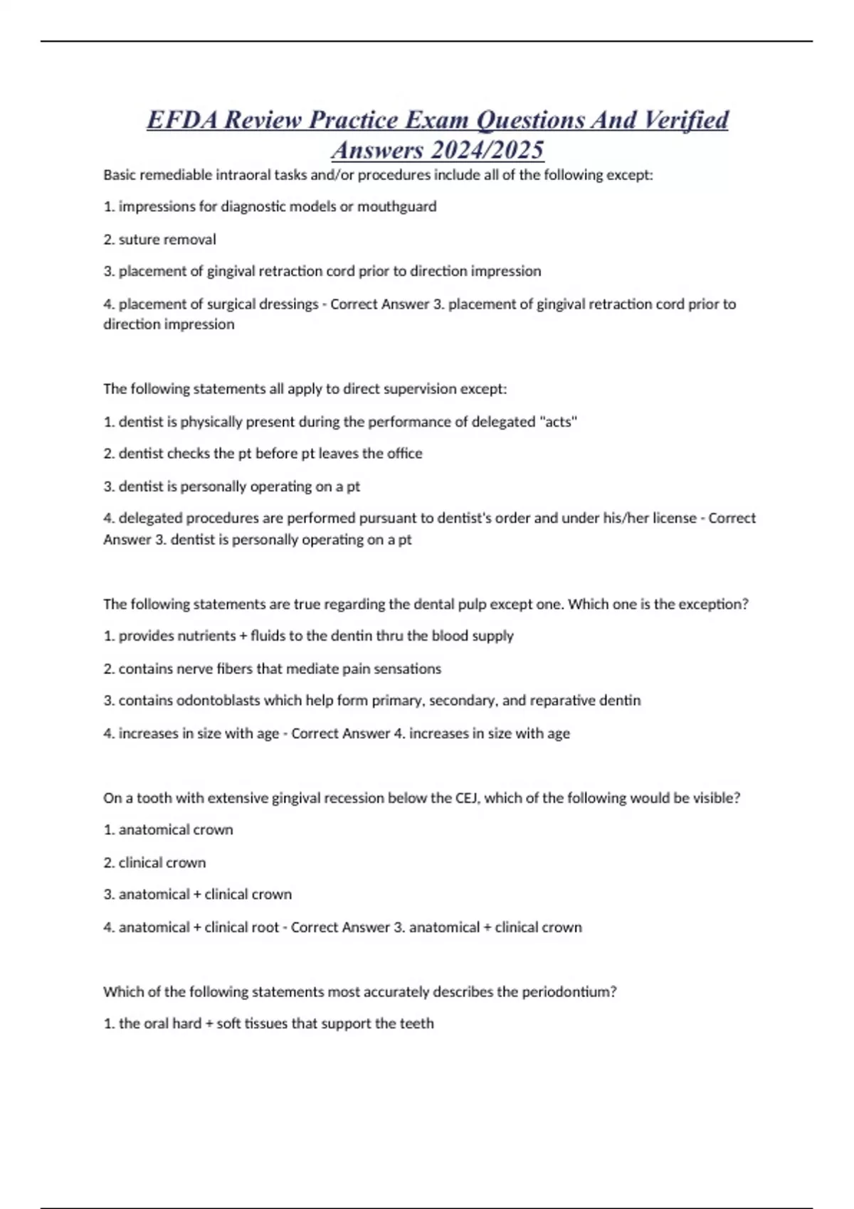 EFDA Review Practice Exam Questions And Verified Answers 2024/2025 Basic remediable intraoral tasks and/or procedures include all of the following except: 1. impressions for diagnostic models or mouthguard 2. suture removal 3. placement of gingival retraction cord prior to direction impression 4. placement of surgical dressings - Correct Answer 3. placement of gingival retraction cord prior to direction impression The following statements all apply to direct supervision except: 1. dentist is physically present during the performance of delegated "acts" 2. dentist checks the pt before pt leaves the office 3. dentist is personally operating on a pt 4. delegated procedures are performed pursuant to dentist's order and under his/her license - Correct Answer 3. dentist is personally operating on a pt The following statements are true regarding the dental pulp except one. Which one is the exception? 1. provides nutrients + fluids to the dentin thru the blood supply 2. contains nerve fibers that mediate pain sensations 3. contains odontoblasts which help form primary, secondary, and reparative dentin 4. increases in size with age - Correct Answer 4. increases in size with age On a tooth with extensive gingival recession below the CEJ, which of the following would be visible? 1. anatomical crown 2. clinical crown 3. anatomical + clinical crown 4. anatomical + clinical root - Correct Answer 3. anatomical + clinical crown Which of the following statements most accurately describes the periodontium? 1. the oral hard + soft tissues that support