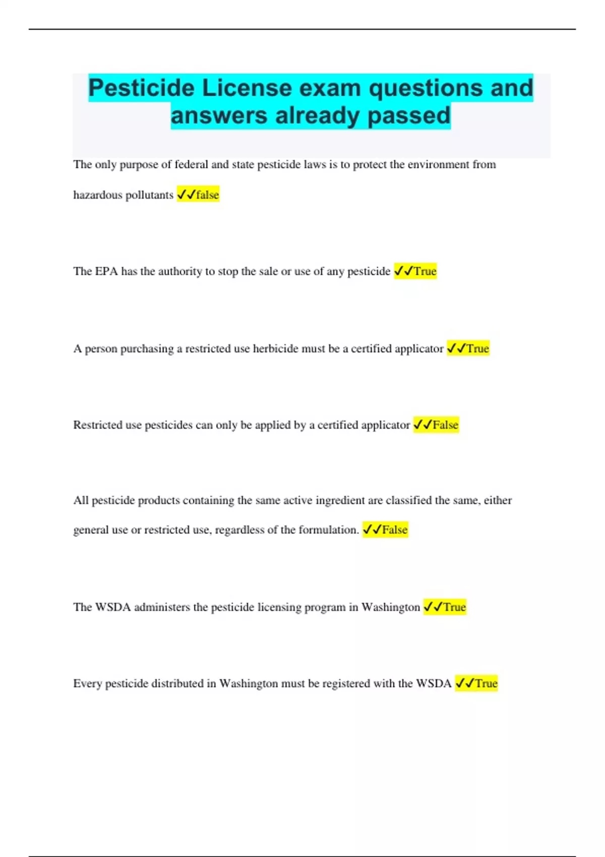 Pesticide License exam questions and answers already passed The only purpose of federal and state pesticide laws is to protect the environment from hazardous pollutants false The EPA has the authority to stop the sale or use of any pesticide True A person purchasing a restricted use herbicide must be a certified applicator True Restricted use pesticides can only be applied by a certified applicator False All pesticide products containing the same active ingredient are classified the same, either general use or restricted use, regardless of the formulation. False The WSDA administers the pesticide licensing program in Washington True Every pesticide distributed in Washington must be registered with the WSDA True SLN registration allows WSDA to register additional application sites to a federal label False If a licensed private applicator in Washington chooses to recertify by course credit, how many recertification credits do they need in five years??? 20 credits If an applicator had two major label violations and was cited by the WSDA, they could face a maximum fine of $15000 and lose their license True Agricultural establishments that have employees who work in recently treated areas must comply with WPS rules True An applicator can avoid harming the environment, misapplying pesticides, and violating the law by reading and following label directions. True The components of a pesticide formulation that controls the pest is the______ ingredient Active Careful pesticide selection is important because pesticide formulations vary in their safety to the user, environment, and crop to be treated; efficacy; and cost. True Which of the following is NOT a concern when handling an emulsifiable concentrate pesticide? 1. high phytotoxicity hazard 2. may be easily absorbed through human and animal skin 3. clogged nozzles and screens 3. Clogged nozzles and screens which of the following formulation dissolve in water??? 1. flowables -dispersible granules 3. soluble powders 3. Soluble powders breathing dust is a potential hazard associated with the mixing of wettable powders and soluble powders True which of the following pesticide formulations must be mixed with water before being used by the applicator? 1. flowables 2. granules 3. dusts 1.Flowables