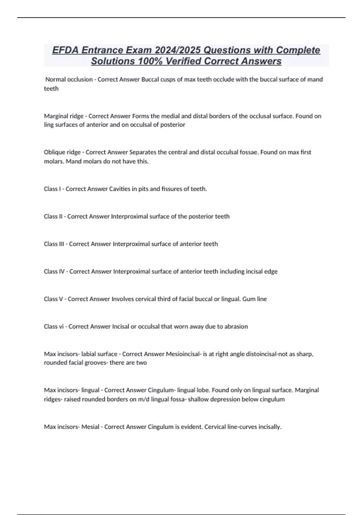 EFDA Entrance Exam 2024/2025 Questions with Complete Solutions 100% Verified Correct Answers Normal occlusion - Correct Answer Buccal cusps of max teeth occlude with the buccal surface of mand teeth Marginal ridge - Correct Answer Forms the medial and distal borders of the occlusal surface. Found on ling surfaces of anterior and on occulsal of posterior Oblique ridge - Correct Answer Separates the central and distal occulsal fossae. Found on max first molars. Mand molars do not have this. Class I - Correct Answer Cavities in pits and fissures of teeth. Class II - Correct Answer Interproximal surface of the posterior teeth Class III - Correct Answer Interproximal surface of anterior teeth Class IV - Correct Answer Interproximal surface of anterior teeth including incisal edge Class V - Correct Answer Involves cervical third of facial buccal or lingual. Gum line Class vi - Correct Answer Incisal or occulsal that worn away due to abrasion Max incisors- labial surface - Correct Answer Mesioincisal- is at right angle distoincisal-not as sharp, rounded facial grooves- there are two Max incisors- lingual - Correct Answer Cingulum- lingual lobe. Found only on lingual surface. Marginal ridges- raised rounded borders on m/d lingual fossa- shallow depression below cingulum Max incisors- Mesial - Correct Answer Cingulum is evident. Cervical line-curves incisally