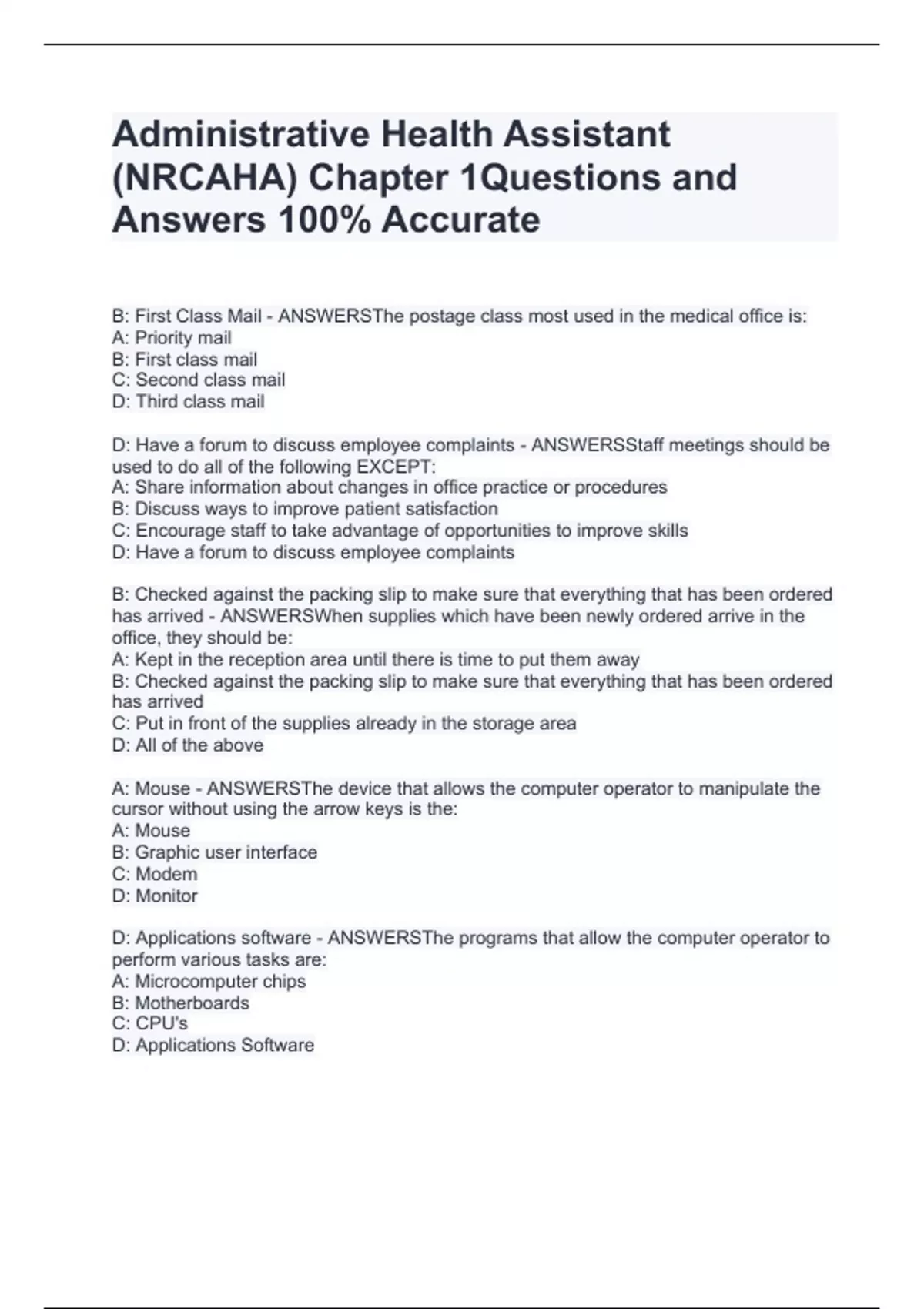 Administrative Health Assistant (NRCAHA) Chapter 1Questions and Answers 100% AccurateAdministrative Health Assistant (NRCAHA) Chapter 1Questions and Answers 100% AccurateAdministrative Health Assistant (NRCAHA) Chapter 1Questions and Answers 100% Accurate B: First Class Mail - ANSWERSThe postage class most used in the medical office is: A: Priority mail B: First class mail C: Second class mail D: Third class mail D: Have a forum to discuss employee complaints - ANSWERSStaff meetings should be used to do all of the following EXCEPT: