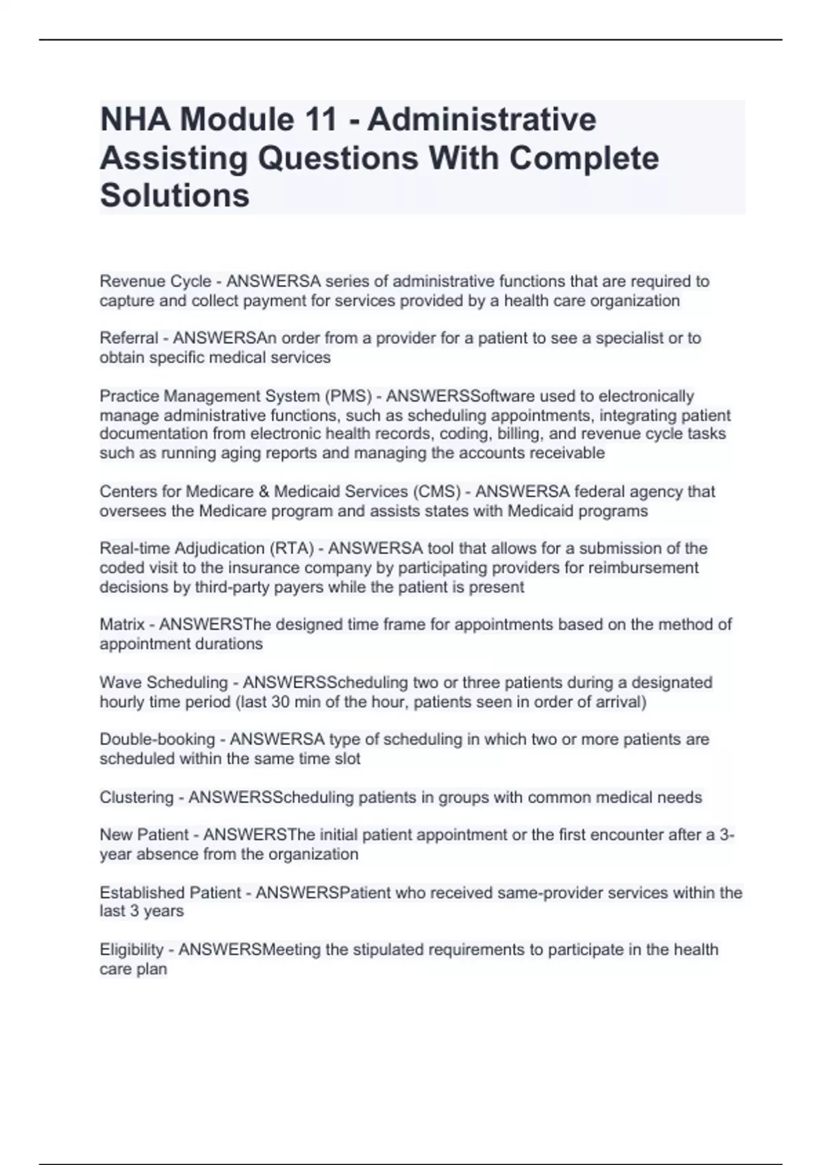 NHA Module 11 - Administrative Assisting Questions With Complete Solutions NHA Module 11 - Administrative Assisting Questions With Complete Solutions NHA Module 11 - Administrative Assisting Questions With Complete Solutions NHA Module 11 - Administrative Assisting Questions With Complete Solutions Revenue Cycle - ANSWERSA series of administrative functions that are required to capture and collect payment for services provided by a health care organization Referral - ANSWERSAn order from a provider for a patient to see a specialist or to obtain specific medical services Practice Management System (PMS) - ANSWERSSoftware used to electronically manage administrative functions, such as scheduling appointments, integrating patient