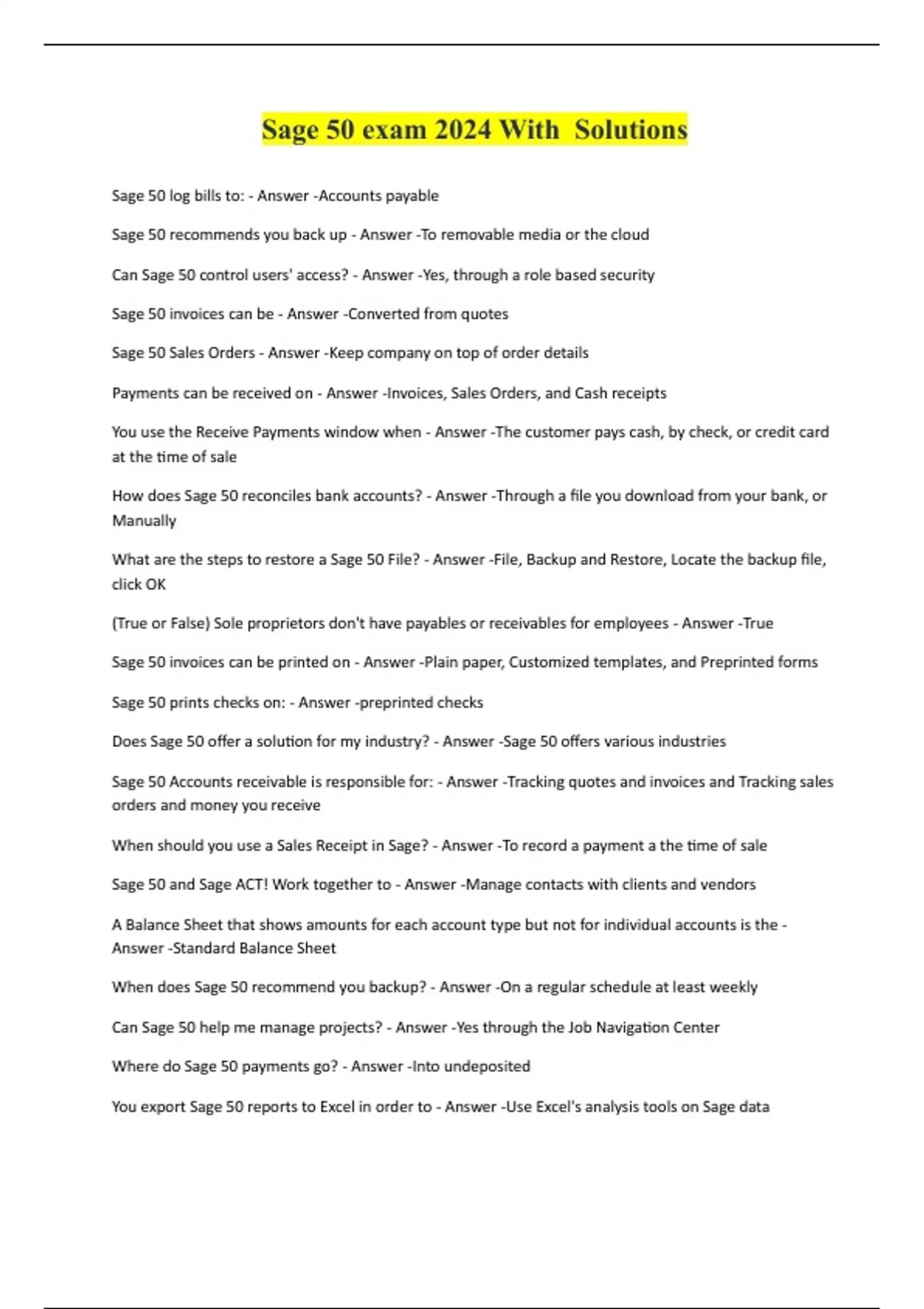 Sage 50 exam 2024 With Solutions