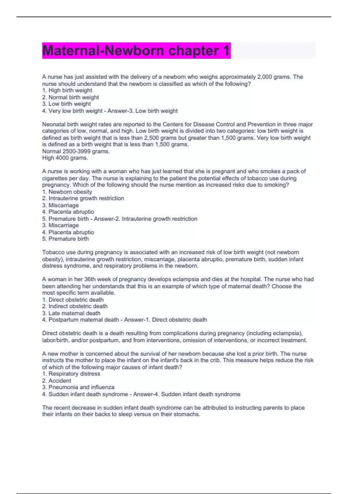 Maternal-Newborn chapter 1 A nurse has just assisted with the delivery of a newborn who weighs approximately 2,000 grams. The nurse should understand that the newborn is classified as which of the following? 1. High birth weight 2. Normal birth weight 3. Low birth weight 4. Very low birth weight - Answer-3. Low birth weight Neonatal birth weight rates are reported to the Centers for Disease Control and Prevention in three major categories of low, normal, and high. Low birth weight is divided into two categories: low birth weight is defined as birth weight that is less than 2,500 grams but greater than 1,500 grams. Very low birth weight is defined as a birth weight that is less than 1,500 grams. Normal grams. High 4000 grams. A nurse is working with a woman who has just learned that she is pregnant and who smokes a pack of cigarettes per day. The nurse is explaining to the patient the potential effects of tobacco use during pregnancy. Which of the following should the nurse mention as increased risks due to smoking? 1. Newborn obesity 2. Intrauterine growth restriction 3. Miscarriage 4. Placenta abruptio 5. Premature birth - Answer-2. Intrauterine growth restriction 3. Miscarriage 4. Placenta abruptio 5. Premature birth Tobacco use during pregnancy is associated with an increased risk of low birth weight (not newborn obesity), intrauterine growth restriction, miscarriage, placenta abruptio, premature birth, sudden infant distress syndrome, and respiratory problems in the newborn. A woman in her 36th week of pregnancy develops eclampsia and dies at the hospital. The nurse who had been attending her understands that this is an example of which type of maternal death? Choose the most specific term available. 1. Direct obstetric death 2. Indirect obstetric death 3. Late maternal death 4. Postpartum maternal death - Answer-1. Direct obstetric death Direct obstetric death is a death resulting from complications during pregnancy (including eclampsia), labor/birth, and/or postpartum, and from interventions, omission of interventions, or incorrect treatment. A new mother is concerned about the survival of her newborn because she lost a prior birth. The nurse instructs the mother to place the infant on the infant's back in the crib. This measure helps reduce the risk of which of the following major causes of infant death? 1. Respiratory distress 2. Accident 3. Pneumonia and influenza 4. Sudden infant death syndrome - Answer-4. Sudden infant death syndrome The recent decrease in sudden infant death syndrome can be attributed