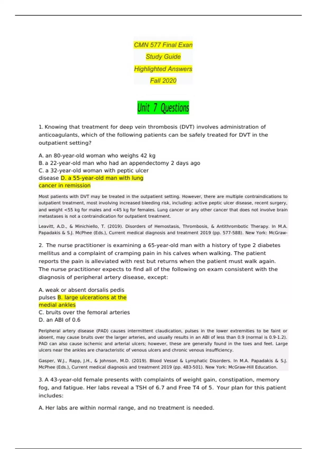 CMN 577 Final Exan Study Guide Highlighted Answers Fall 2020 Unit 7 Questions 1. Knowing that treatment for deep vein thrombosis (DVT) involves administration of anticoagulants, which of the following patients can be safely treated for DVT in the outpatient setting? A. an 80-year-old woman who weighs 42 kg B. a 22-year-old man who had an appendectomy 2 days ago C. a 32-year-old woman with peptic ulcer disease D. a 55-year-old man with lung cancer in remission 2. The nurse practitioner is examining a 65-year-old man with a history of type 2 diabetes mellitus and a complaint of cramping pain in his calves when walking. The patient reports the pain is alleviated with rest but returns when the patient must walk again. The nurse practitioner expects to find all of the following on exam consistent with the diagnosis of peripheral artery disease, except: A. weak or absent dorsalis pedis pulses B. large ulcerations at the medial ankles C. bruits over the femoral arteries D. an ABI of 0.6 3. A 43-year-old female presents with complaints of weight gain, constipation, memory fog, and fatigue. Her labs reveal a TSH of 6.7 and Free T4 of 5. Your plan for this patient includes: A. Her labs are within normal range, and no treatment is needed. B. Start her on Synthroid at 1.6mcg/kg/day and recheck labs in 4-6 weeks. C. Instruct her to take her Synthroid on a full stomach for best absorption. D. Start her on Synthroid at 0.8mcg/kg/day and recheck labs in 2 weeks. 4. Cigarette smoking may falsely increase the levels of: A. gamma-glutamyl transpeptidase B. sodium and potassium concentrations C. hepatic enzymes D. serum protein electrophoresis 5. A 75-year-old female patient who is healthy and active reports that she has recently been having trouble getting to the bathroom on time to urinate and also has some leaks when she sneezes or coughs. She reports having to wear an incontinence pad daily. She is very independent and is embarrassed and worried that this is going to affect her lifestyle. As her provider, your best next steps for this patient would be: A. Refer her to urology, her symptoms will only get worse and she will more than likely need surgery B. Suggest bladder training and pelvic floor muscle exercises (Kegel’s) to decrease incidences of stress and urge incontinence C. Prescribe an antimuscarinic agent such as oxybutynin immediately D. Schedule the patient for insertion of a pessary 6. A 40-year-old female waitress presents to the clinic complaining of pain, burning, and tingling in her hands and fingers. She reports the symptoms are most bothersome at night. The NP has carpal tunnel syndrome as a differential diagnosis. All of the following are used to rule in or out this diagnosis EXCEPT: A. Tinel test B. Phalen test C. Spurling test D. Carpal compression test 7. A 66-year-old Hispanic female presents with a two-year history of detrusor overactivity or “urge incontinence. She has been treated by a physical therapist with bladder training therapy for one year, buts fail to provide appropriate relief. The next possible treatment would be: A. Tolterodine 1-2 mg orally 2x daily B. Oxybutynin 2.5 – 5mg orally 2-3x daily C. Refer to OB/Gyn for a pessary fitting D. All of the above 8. A 23-year-old male patient presents to the clinic with complaints of fever, irritative voiding symptoms, and perineal/suprapubic pain for 2 days. On exam, the CBC shows leukocytosis and a left shift. UA is positive for pyuria and bacteriuria. There is no CVA tenderness or painful scrotal enlargement. The NP suspects the patient has which of the following diagnosis? A. Acute Bacterial Prostatitis B. Chronic Bacterial Prostatitis C. Acute Epididymitis D. Prostatodynia 9. A 24-year-old female who identifies as a lesbian, presents for her annual wellness visit. She has multiple female sexual partners. She did not receive the HPV vaccine and has not had a cervical cancer screening since she was 21 years old. Which of the following is not recommended in the treatment plan for this patient? A. HPV vaccination series B. Papanicolaou (PAP) smear with HPV co-testing C. Chlamydia trachomatis and Neisseria gonorrhea testing D. Screen for Intimate Partner Violence (IPV) 10. All of the following can help reduce the risk of adolescents developing STIs EXCEPT: A. a monogamous sexual relationship with one partner B. the use of a condom C. abstinence D. birth control 11. A 57-year-old female comes into the clinic with complaints of hot flashes and vaginal dryness. She is a smoker and has hypertension. When giving her hormone replacement options, the NP informs her best option is: A. Oral estrogen B. Oral estrogen with progesterone C. Estradiol injections D. Transdermal estrogen 12. When evaluating a patient with intermittent claudication, the Nurse Practitioner would expect to find all the following except: A. Diminished femoral pulses B. An ankle-brachial index of 1.0 C. Reproducible pain in the calf muscles when walking D. An ankle-brachial index of 0.8 13. A 17-year-old sexually active female presents to the clinic with complaints of vaginal pruritis, dysuria, and a thick, greenish, malodorous discharge. After further testing, it is confirmed that she is positive for Trichomoniasis. Which of the following treatment options would the NP choose for this patient? A. Ceftriaxone, 250 mg IM x 1 and Azithromycin, 1 g orally as single dose B. Metronidazole, 2 g orally as single dose C. Azithromycin, 1 g orally as single dose D. Benzathine penicillin G, 2.4 million units IM 14. A woman presents to the clinic at 12 weeks gestation. She has a history of preeclampsia with a previous pregnancy. The NP should consider prescribing which of the following? A. low salt diet B. vitamin C C. hydrochlorothiazide D. low dose aspirin 15. Jane is 26 weeks pregnant. Her 50-g one-hour oral glucose tolerance test results at 164 mg/dL. What is the NP’s next step? A. start Jane on metformin B. start Jane on insulin C. order a 100-g oral glucose toleran