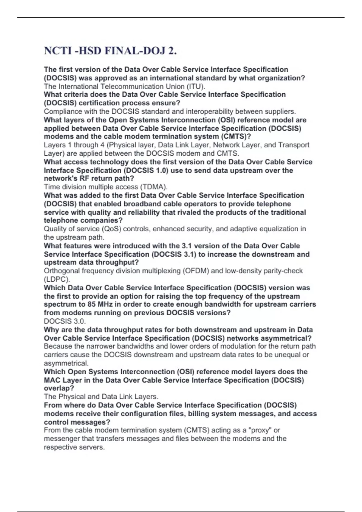 NCTI -HSD FINAL-DOJ 2. The first version of the Data Over Cable Service Interface Specification (DOCSIS) was approved as an international standard by what organization? The International Telecommunication Union (ITU). What criteria does the Data Over Cable Service Interface Specification (DOCSIS) certification process ensure? Compliance with the DOCSIS standard and interoperability between suppliers. What layers of the Open Systems Interconnection (OSI) reference model are applied between Data Over Cable Service Interface Specification (DOCSIS) modems and the cable modem termination system (CMTS)? Layers 1 through 4 (Physical layer, Data Link Layer, Network Layer, and Transport Layer) are applied between the DOCSIS modem and CMTS. What access technology does the first version of the Data Over Cable Service Interface Specification (DOCSIS 1.0) use to send data upstream over the network's RF return path? Time division multiple access (TDMA). What was added to the first Data Over Cable Service Interface Specification (DOCSIS) that enabled broadband cable operators to provide telephone service with quality and reliability that rivaled the products of the traditional telephone companies? Quality of service (QoS) controls, enhanced security, and adaptive equalization in the upstream path. What features were introduced with the 3.1 version of the Data Over Cable Service Interface Specification (DOCSIS 3.1) to increase the downstream and upstream data throughput? Orthogonal frequency division multiplexing (OFDM) and low-density parity-check (LDPC). Which Data Over Cable Service Interface Specification (DOCSIS) version was the first to provide an option for raising the top frequency of the upstream spectrum to 85 MHz in order to create enough bandwidth for upstream carriers from modems running on previous DOCSIS versions? DOCSIS 3.0. Why are the data throughput rates for both downstream and upstream in Data Over Cable Service Interface Specification (DOCSIS) networks asymmetrical? Because the narrower bandwidths and lower orders of modulation for the return path carriers cause the DOCSIS downstream and upstream data rates to be unequal or asymmetrical. Which Open Systems Interconnection (OSI) reference model layers does the MAC Layer in the Data Over Cable Service Interface Specification (DOCSIS) overlap? The Physical and Data Link Layers. From where do Data Over Cable Service Interface Specification (DOCSIS) modems receive their configuration files, billing system messages, and access control messages? From the cable modem termination system (CMTS) acting as a "proxy" or messenger that transfers messages and files between the modems and the respective servers.
