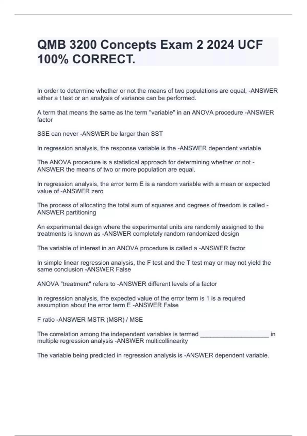 In order to determine whether or not the means of two populations are equal, -ANSWER either a t test or an analysis of variance can be performed. A term that means the same as the term "variable" in an ANOVA procedure -ANSWER factor SSE can never -ANSWER be larger than SST In regression analysis, the response variable is the -ANSWER dependent variable The ANOVA procedure is a statistical approach for determining whether or not -ANSWER the means of two or more population are equal. In regression analysis, the error term E is a random variable with a mean or expected value of -ANSWER zero The process of allocating the total sum of squares and degrees of freedom is called -ANSWER partitioning An experimental design where the experimental units are randomly assigned to the treatments is known as -ANSWER completely random randomized design The variable of interest in an ANOVA procedure is called a -ANSWER factor In simple linear regression analysis, the F test and the T test may or may not yield the same conclusion -ANSWER False ANOVA "treatment" refers to -ANSWER different levels of a factor In regression analysis, the expected value of the error term is 1 is a required assumption about the error term E -ANSWER False F ratio -ANSWER MSTR (MSR) / MSE The correlation among the independent variables is termed ____________________ in multiple regression analysis -ANSWER multicollinearity The variable being predicted in regression analysis is -ANSWER dependent variable.