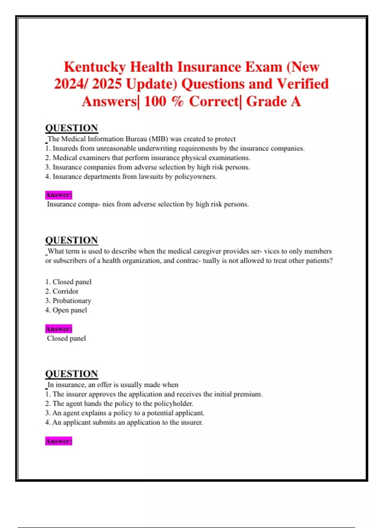 Kentucky Health Insurance Exam (New 2024/ 2025 Update) Questions and Verified Answers| 100 % Correct| Grade A QUESTION The Medical Information Bureau (MIB) was created to protect 1. Insureds from unreasonable underwriting requirements by the insurance companies. 2. Medical examiners that perform insurance physical examinations. 3. Insurance companies from adverse selection by high risk persons. 4. Insurance departments from lawsuits by policyowners. Answer: Insurance compa- nies from adverse selection by high risk persons. QUESTION What term is used to describe when the medical caregiver provides ser- vices to only members or subscribers of a health organization, and contrac- tually is not allowed to treat other patients? 1. Closed panel 2. Corridor 3. Probationary 4. Open panel Answer: Closed panel QUESTION In insurance, an offer is usually made when 1. The insurer approves the application and receives the initial premium. 2. The agent hands the policy to the policyholder. 3. An agent explains a policy to a potential applicant. 4. An applicant submits an application to the insurer. Answer: An applicant submits an application to the insurer. QUESTION What is the term used for an applicant's written request to an insurer for the company to issue a contract, based on the information provided? 1. Policy Request 2. Insurance Request Form 3. Request for Insurance 4. Application Answer: Application QUESTION All of the following are correct about the required provisions of a health insurance policy EXCEPT 1. A reinstated policy provides immediate coverage for an illness. 2. Proof-of-loss forms must be sent to the insured within 15 days of notice of claim. 3. A grace period of 31 days is found in an annual pay policy. 4. The entire contract clause means the signed application, policy, endorse- ments, and attachments constitute the entire contract. Answer: A reinstated policy provides immediate coverage for an illness. QUESTION A hearing may be held when requested in writing, when required by the Insurance Code, or when 1. An insurance company feels it should be required. 2. A foreign insurance company is involved. 3. The Commissioner finds it necessary. 4. The Governor feels it would be beneficial. Answer: The Commissioner finds it neces- sary. QUESTION Most LTC plans have which of the following features? 1. Variable premiums 2. Open enrollment 3. Guaranteed renewability 4. No elimination period Answer: Guaranteed renewability QUESTION An insured has medical insurance coverage through 2 different providers, both covering the same expenses on an expense-incurred basis. Neither company knows in advance that the insured has coverage through any other insurers. The insured submits a claim to both insurers. How
