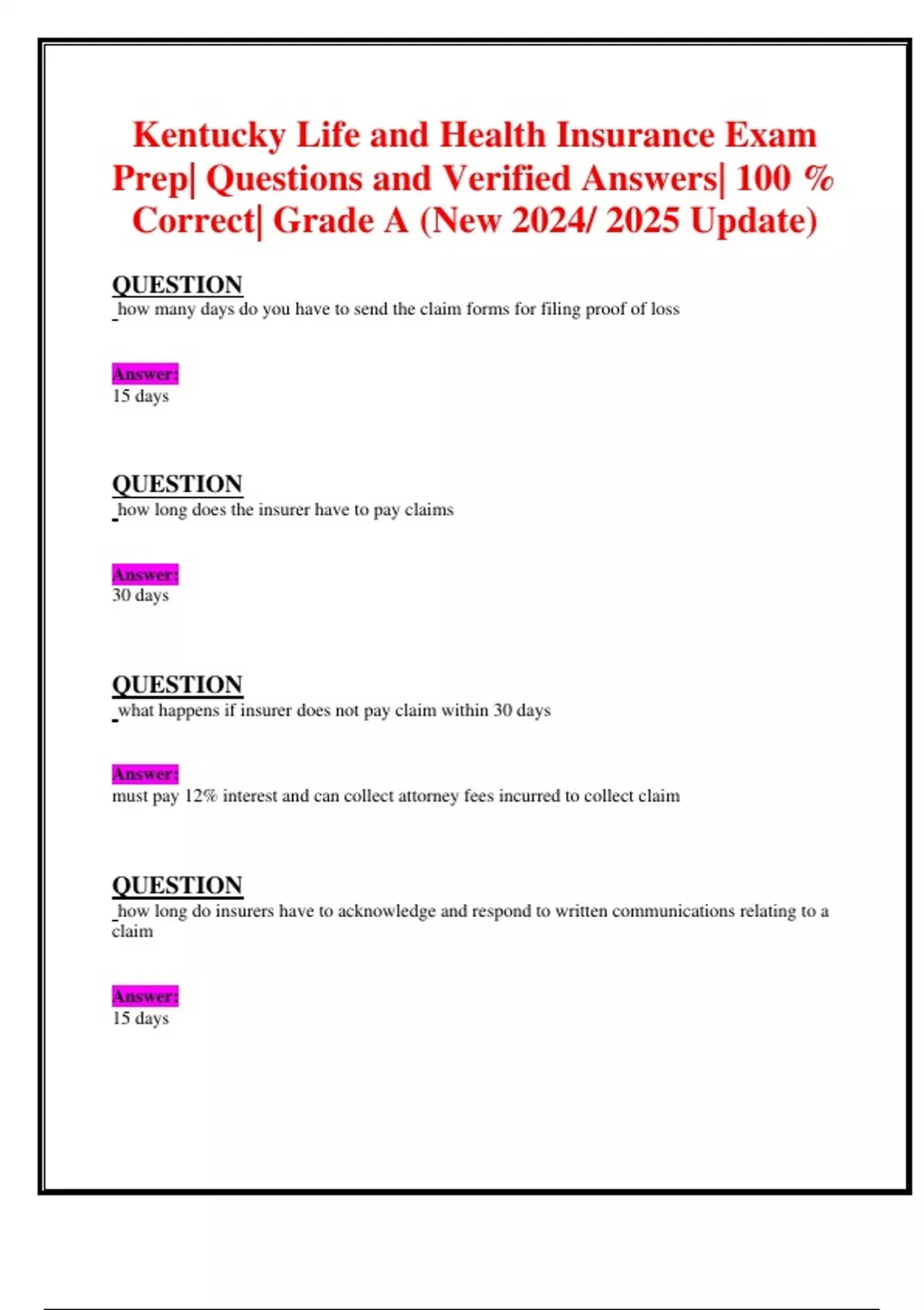 Kentucky Life and Health Insurance Exam Prep| Questions and Verified Answers| 100 % Correct| Grade A (New 2024/ 2025 Update) QUESTION how many days do you have to send the claim forms for filing proof of loss Answer: 15 days QUESTION how long does the insurer have to pay claims Answer: 30 days QUESTION what happens if insurer does not pay claim within 30 days Answer: must pay 12% interest and can collect attorney fees incurred to collect claim QUESTION how long do insurers have to acknowledge and respond to written communications relating to a claim Answer: 15 days QUESTION how long do insurers have to notify if a claim is denied Answer: 15 days QUESTION IN THE TYPICAL INSURANCE SALE, WHO MAKES THE INITIAL OFFER Answer: the applicant makes the initial offer through the application and premium deposit QUESTION in what common situation would an insurer make a counteroffer to the applicant Answer: someone has elevated risk factors QUESTION identify and explain 5 legal characteristics of insurance contracts Answer: contract of adhesion aleatory personal unilateral conditional QUESTION what is the difference between a valued contract and an indemnity contract Answer: indemnity contract (health) pays for things at face value valued contracts (life) will pay stated amount regardless of value QUESTION explain the difference between a representation and a warranty, and how they relate to statments made by an insurance applicant Answer: warranty is a promise made by the insurer, a statement presented as absolute truth representation is believed to be true to the best of the applicants knowledge misrepresentation (lying on an app) can void a contract QUESTION whats the difference between a waiver and estoppel and how are they related Answer: waiver- when one party willingly gives