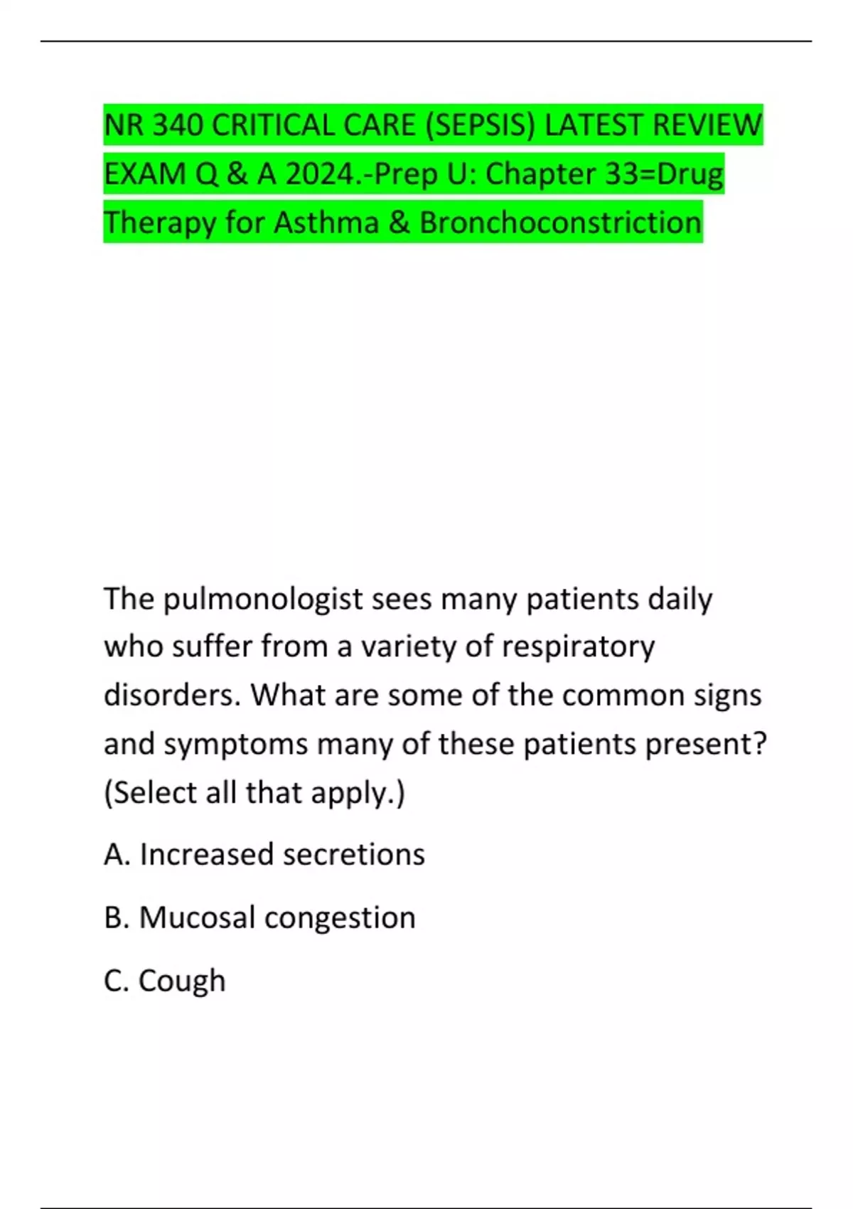 NR 340 CRITICAL CARE (SEPSIS) LATEST REVIEW EXAM Q & A 2024.-Prep U: Chapter 33=Drug Therapy for Asthma & Bronchoconstriction