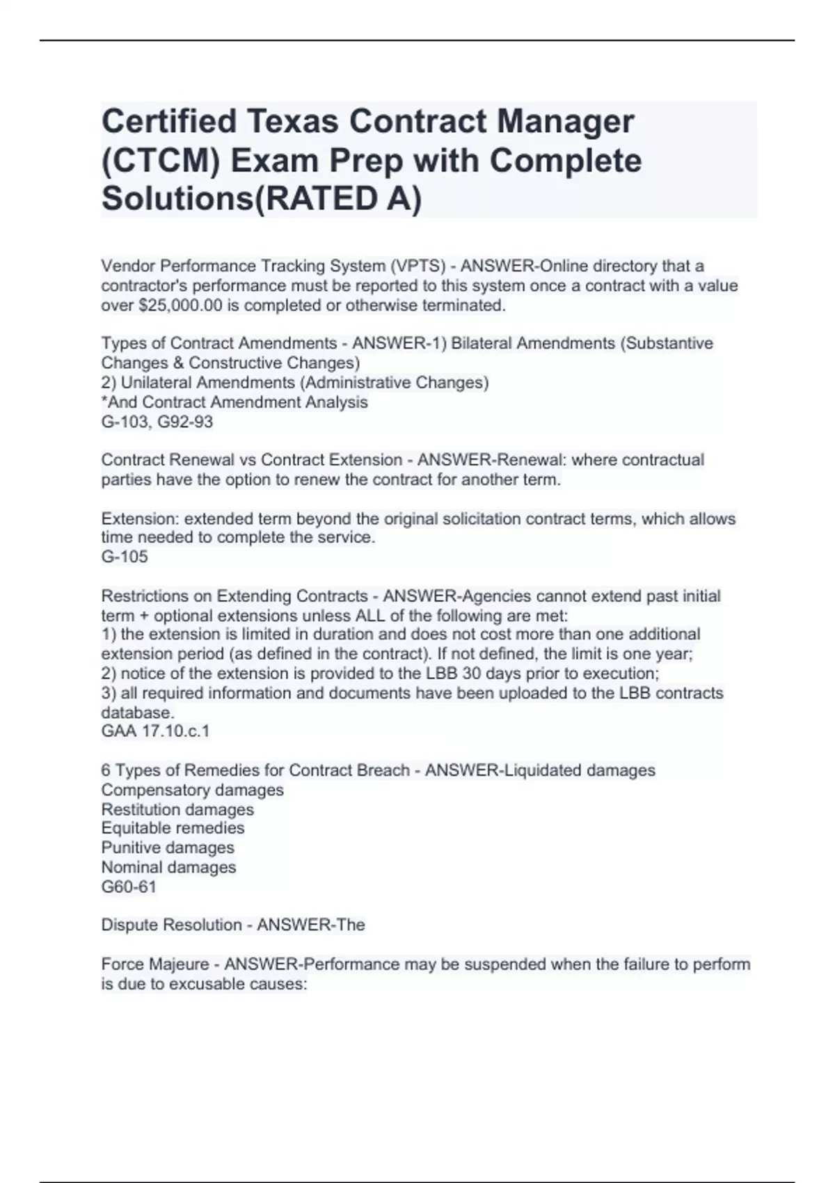 Vendor Performance Tracking System (VPTS) - ANSWER-Online directory that a contractor's performance must be reported to this system once a contract with a value over $25,000.00 is completed or otherwise terminated. Types of Contract Amendments - ANSWER-1) Bilateral Amendments (Substantive Changes & Constructive Changes) 2) Unilateral Amendments (Administrative Changes) *And Contract Amendment Analysis G-103, G92-93 Contract Renewal vs Contract Extension - ANSWER-Renewal: where contractual parties have the option to renew the contract for another term. Extension: extended term beyond the original solicitation contract terms, which allows time needed to complete the service. G-105 Restrictions on Extending Contracts - ANSWER-Agencies cannot extend past initial term + optional extensions unless ALL of the following are met: 1) the extension is limited in duration and does not cost more than one additional extension period (as defined in the contract). If not defined, the limit is one year; 2) notice of the extension is provided to the LBB 30 days prior to execution; 3) all required information and documents have been uploaded to the LBB contracts database. GAA 17.10.c.1 6 Types of Remedies for Contract Breach - ANSWER-Liquidated damages Compensatory damages Restitution damages Equitable remedies Punitive damages Nominal damages