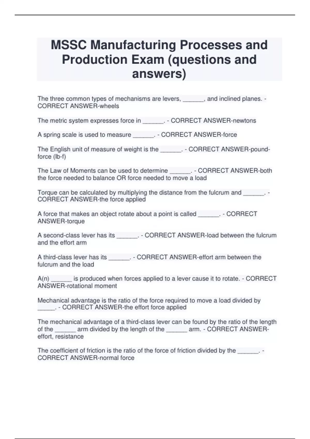 MSSC Manufacturing Processes and Production Exam (questions and answers) The three common types of mechanisms are levers, ______, and inclined planes. - CORRECT ANSWER-wheels The metric system expresses force in ______. - CORRECT ANSWER-newtons A spring scale is used to measure ______. - CORRECT ANSWER-force The English unit of measure of weight is the ______. - CORRECT ANSWER-poundforce (lb-f) The Law of Moments can be used to determine ______. - CORRECT ANSWER-both the force needed to balance OR force needed to move a load Torque can be calculated by multiplying the distance from the fulcrum and ______. - CORRECT ANSWER-the force applied A force that makes an object rotate about a point is called ______. - CORRECT ANSWER-torque A second-class lever has its ______. - CORRECT ANSWER-load between the fulcrum and the effort arm A third-class lever has its ______. - CORRECT ANSWER-effort arm between the fulcrum and the load A(n) ______ is produced when forces applied to a lever cause it to rotate. - CORRECT ANSWER-rotational moment Mechanical advantage is the ratio of the force required to move a load divided by _____. - CORRECT ANSWER-the effort force applied The mechanical advantage of a third-class lever can be found by the ratio of the length of the ______ arm divided by the length of the ______ arm. - CORRECT ANSWEReffort, resistance The coefficient of friction is the ratio of the force of friction divided by the ______. - CORRECT ANSWER-normal force Rolling friction is ______. - CORRECT ANSWER-less than both static and kinetic friction What is the unit of measure for the coefficient of friction? - CORRECT ANSWER-it has no unit One application that takes advantage if both high and low friction is a(n) ______. - CORRECT ANSWER-belt sande