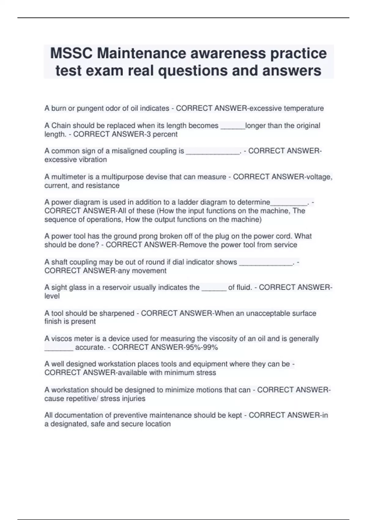 MSSC Maintenance awareness practice test exam real questions and answers A burn or pungent odor of oil indicates - CORRECT ANSWER-excessive temperature A Chain should be replaced when its length becomes ______longer than the original length. - CORRECT ANSWER-3 percent A common sign of a misaligned coupling is _____________. - CORRECT ANSWERexcessive vibration A multimeter is a multipurpose devise that can measure - CORRECT ANSWER-voltage, current, and resistance A power diagram is used in addition to a ladder diagram to determine_________. - CORRECT ANSWER-All of these (How the input functions on the machine, The sequence of operations, How the output functions on the machine) A power tool has the ground prong broken off of the plug on the power cord. What should be done? - CORRECT ANSWER-Remove the power tool from service A shaft coupling may be out of round if dial indicator shows _____________. - CORRECT ANSWER-any movement A sight glass in a reservoir usually indicates the ______ of fluid. - CORRECT ANSWERlevel A tool should be sharpened - CORRECT ANSWER-When an unacceptable surface finish is present A viscos meter is a device used for measuring the viscosity of an oil and is generally _______ accurate. - CORRECT ANSWER-95%-99% A well designed workstation places tools and equipment where they can be - CORRECT ANSWER-available with minimum stress A workstation should be designed to minimize motions that can - CORRECT ANSWERcause repetitive/ stress injuries All documentation of preventive maintenance should be kept - CORRECT ANSWER-in a designated, safe and secure locatio