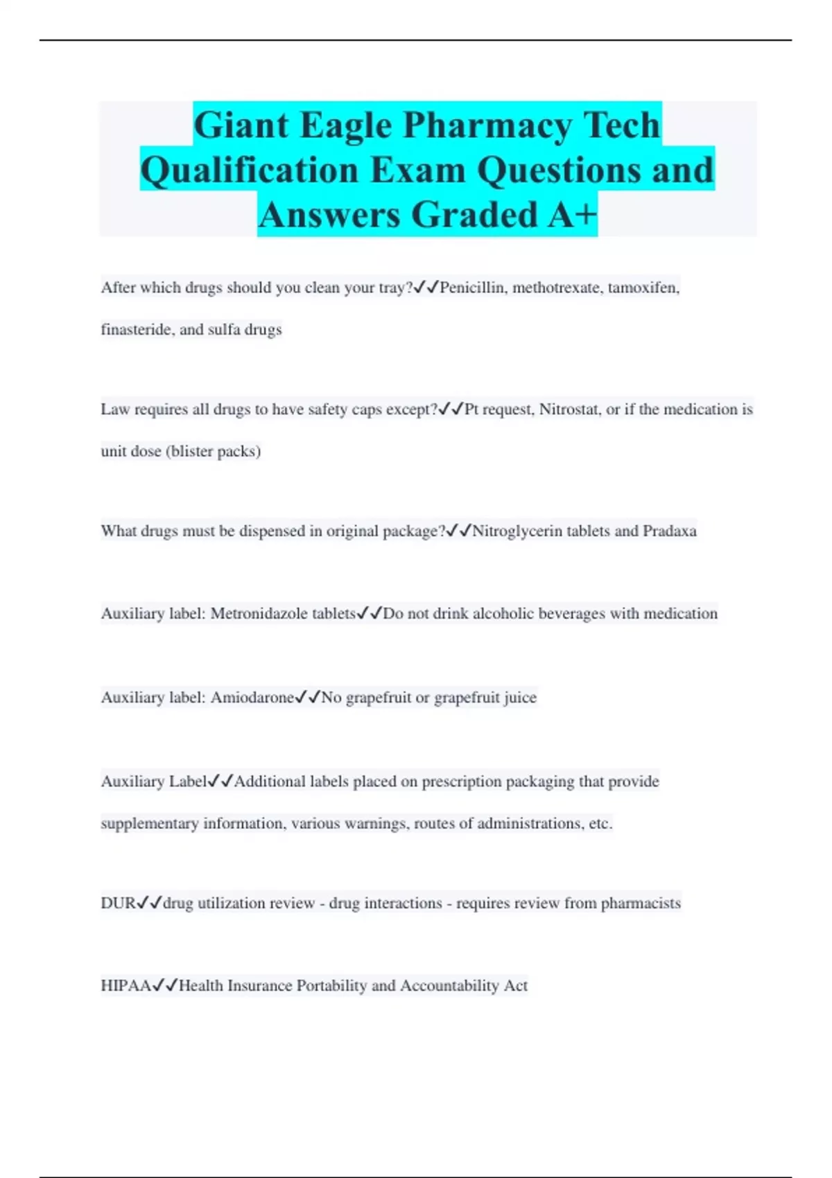 Giant Eagle Pharmacy Tech Qualification Exam Questions and Answers Graded A+ After which drugs should you clean your tray?Penicillin, methotrexate, tamoxifen, finasteride, and sulfa drugs Law requires all drugs to have safety caps except?Pt request, Nitrostat, or if the medication is unit dose (blister packs) What drugs must be dispensed in original package?Nitroglycerin tablets and Pradaxa