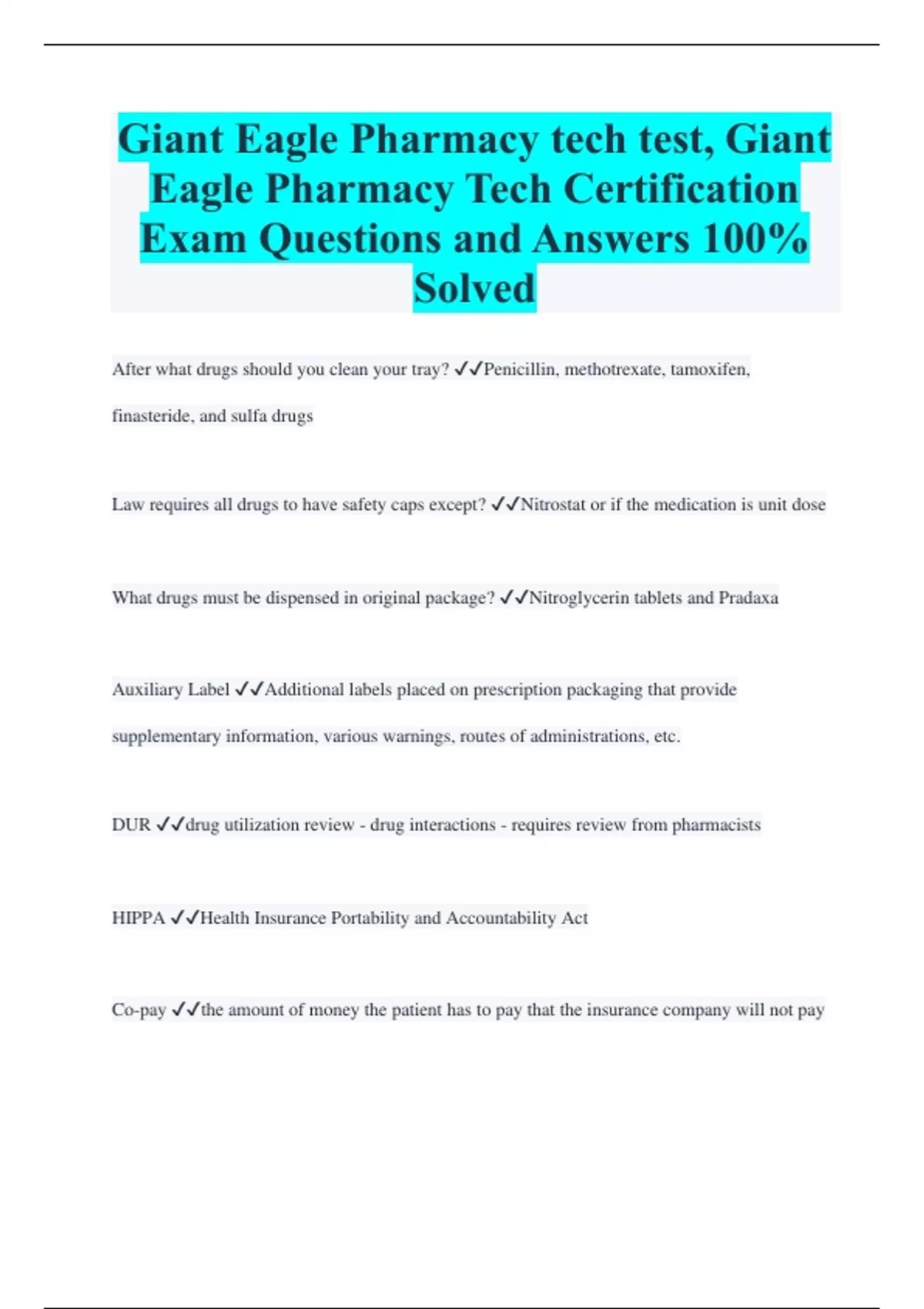 Giant Eagle Pharmacy tech test, Giant Eagle Pharmacy Tech Certification Exam Questions and Answers 100% Solved After what drugs should you clean your tray? Penicillin, methotrexate, tamoxifen, finasteride, and sulfa drugs Law requires all drugs to have safety caps except? Nitrostat or if the medication is unit dose What drugs must be dispensed in original package? Nitroglycerin tablets and Pradaxa