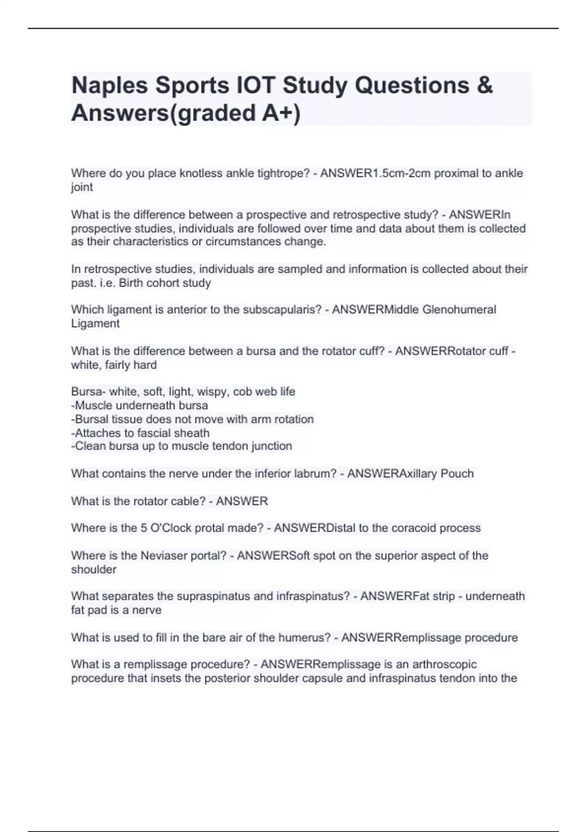 Where do you place knotless ankle tightrope? - ANSWER1.5cm-2cm proximal to ankle joint What is the difference between a prospective and retrospective study? - ANSWERIn prospective studies, individuals are followed over time and data about them is collected as their characteristics or circumstances change. In retrospective studies, individuals are sampled and information is collected about their past. i.e. Birth cohort study Which ligament is anterior to the subscapularis? - ANSWERMiddle Glenohumeral Ligament What is the difference between a bursa and the rotator cuff? - ANSWERRotator cuff - white, fairly hard Bursa- white, soft, light, wispy, cob web life -Muscle underneath bursa -Bursal tissue does not move with arm rotation -Attaches to fascial sheath -Clean bursa up to muscle tendon junction What contains the nerve under the inferior labrum? - ANSWERAxillary Pouch What is the rotator cable? - ANSWER Where is the 5 O'Clock protal made? - ANSWERDistal to the coracoid process Where is the Neviaser portal? - ANSWERSoft spot on the superior aspect of the shoulder What separates the supraspinatus and infraspinatus? - ANSWERFat strip - underneath fat pad is a nerve What is used to fill in the bare air of the humerus? - ANSWERRemplissage procedure What is a remplissage procedure? - ANSWERRemplissage is an arthroscopic procedure that insets the posterior shoulder capsule and infraspinatus tendon into the Hill-Sachs defect, converting the intra-articular location of the defect to an extra-articular one.