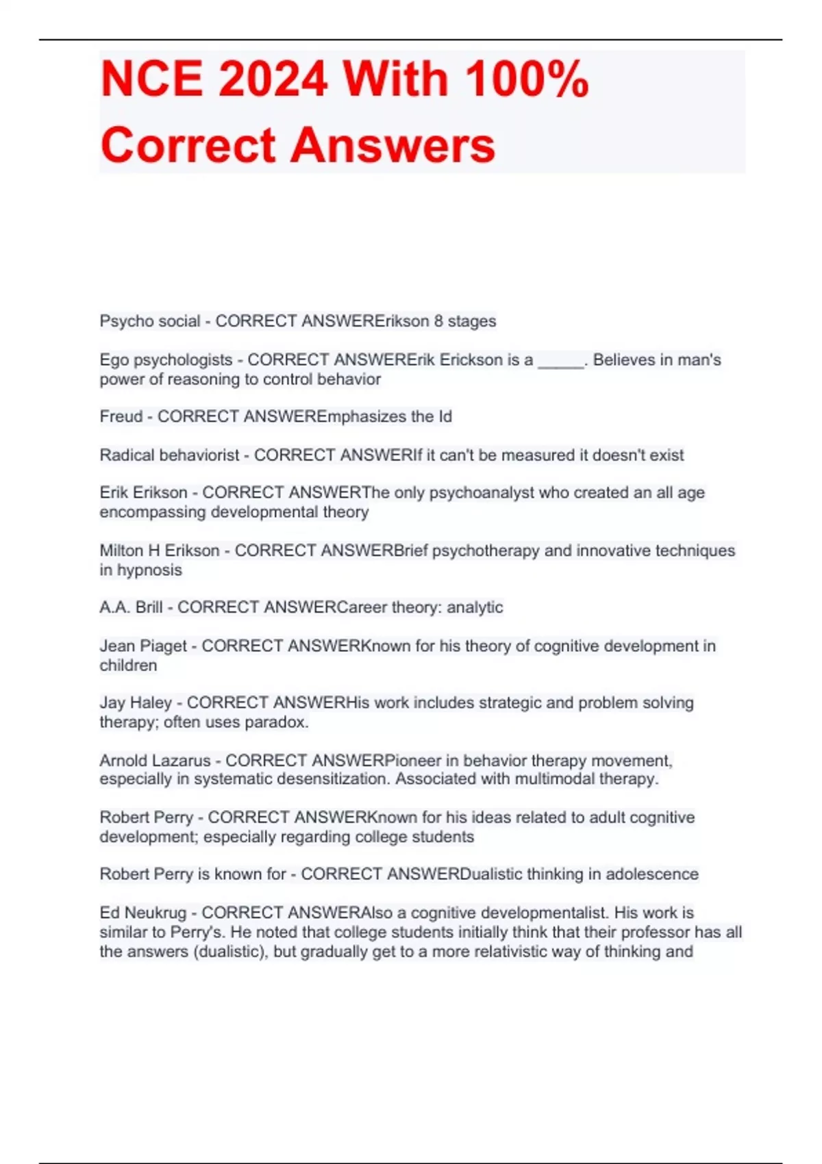 Psycho social - CORRECT ANSWERErikson 8 stages Ego psychologists - CORRECT ANSWERErik Erickson is a _____. Believes in man's power of reasoning to control behavior Freud - CORRECT ANSWEREmphasizes the Id Radical behaviorist - CORRECT ANSWERIf it can't be measured it doesn't exist Erik Erikson - CORRECT ANSWERThe only psychoanalyst who created an all age encompassing developmental theory Milton H Erikson - CORRECT ANSWERBrief psychotherapy and innovative techniques in hypnosis A.A. Brill - CORRECT ANSWERCareer theory: analytic Jean Piaget - CORRECT ANSWERKnown for his theory of cognitive development in children Jay Haley - CORRECT ANSWERHis work includes strategic and problem solving therapy; often uses paradox. Arnold Lazarus - CORRECT ANSWERPioneer in behavior therapy movement, especially in systematic desensitization. Associated with multimodal therapy. Robert Perry - CORRECT ANSWERKnown for his ideas related to adult cognitive development; especially regarding college students Robert Perry is known for - CORRECT ANSWERDualistic thinking in adolescence Ed Neukrug - CORRECT ANSWERAlso a cognitive developmentalist. His work is similar to Perry's. He noted that college students initially think that their professor has all the answers (dualistic), but gradually get to a more r