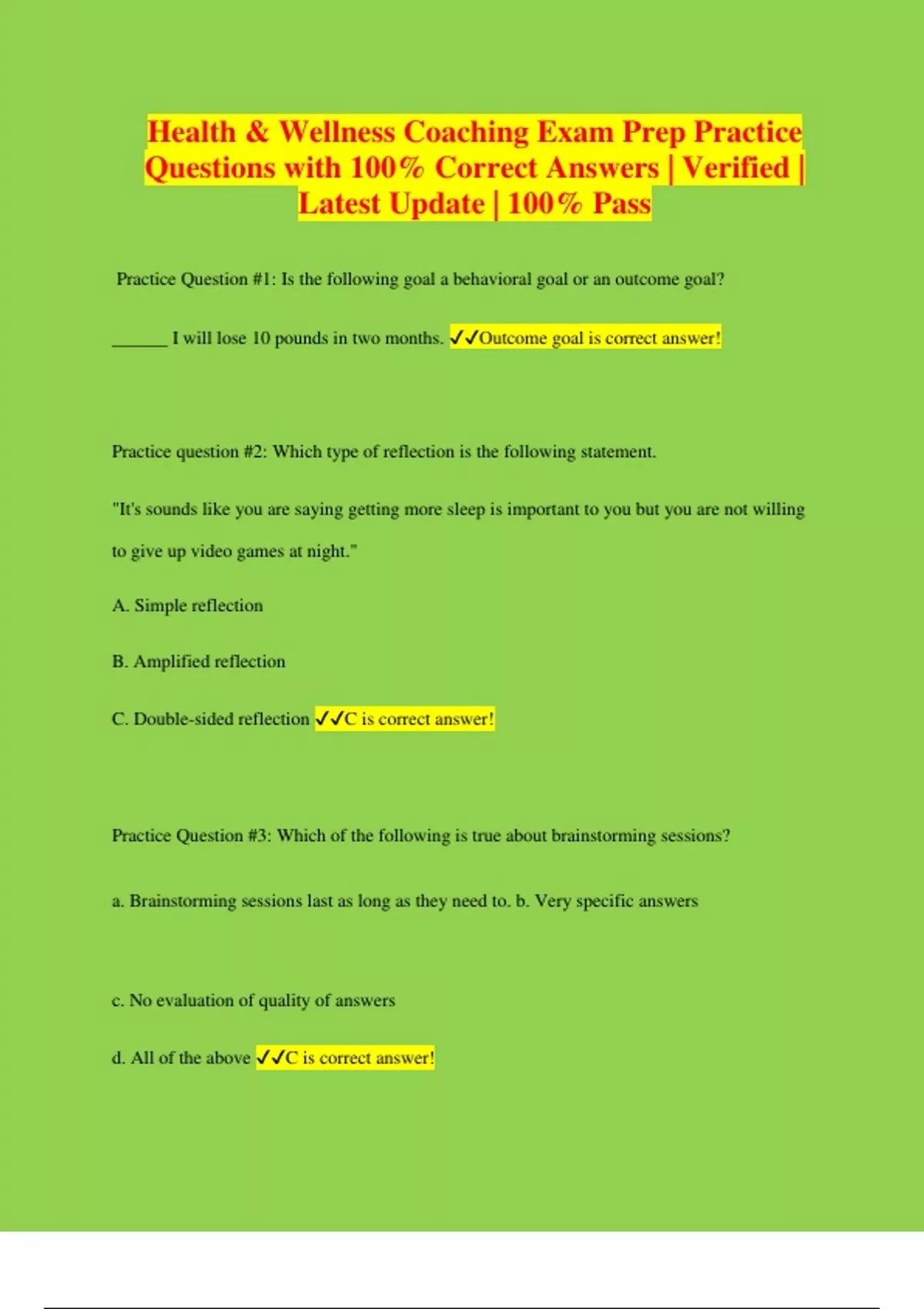 Health & Wellness Coaching Exam Prep Practice Questions with 100% Correct Answers | Verified | Latest Update | 100% Pass Practice Question #1: Is the following goal a behavioral goal or an outcome goal? ______ I will lose 10 pounds in two months. Outcome goal is correct answer! Practice question #2: Which type of reflection is the following statement. "It's sounds like you are saying getting more sleep is important to you but you are not willing to give up video games at night." A. Simple reflection B. Amplified reflection C. Double-sided reflection C is correct answer! Practice Question #3: Which of the following is true about brainstorming sessions? a. Brainstorming sessions last as long as they need to. b. Very specific answers c. No evaluation of quality of answers d. All of the above C is correct answer!