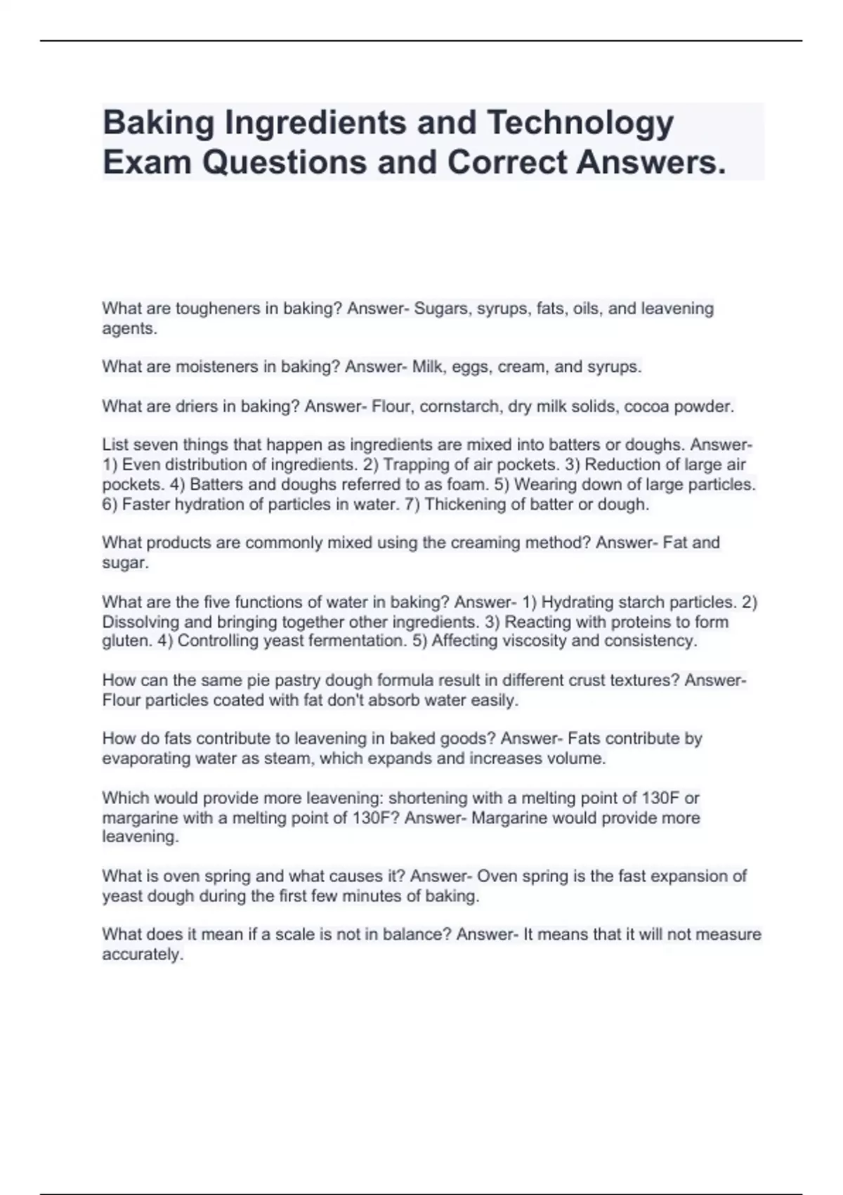 Baking Ingredients and Technology Exam Questions and Correct Answers