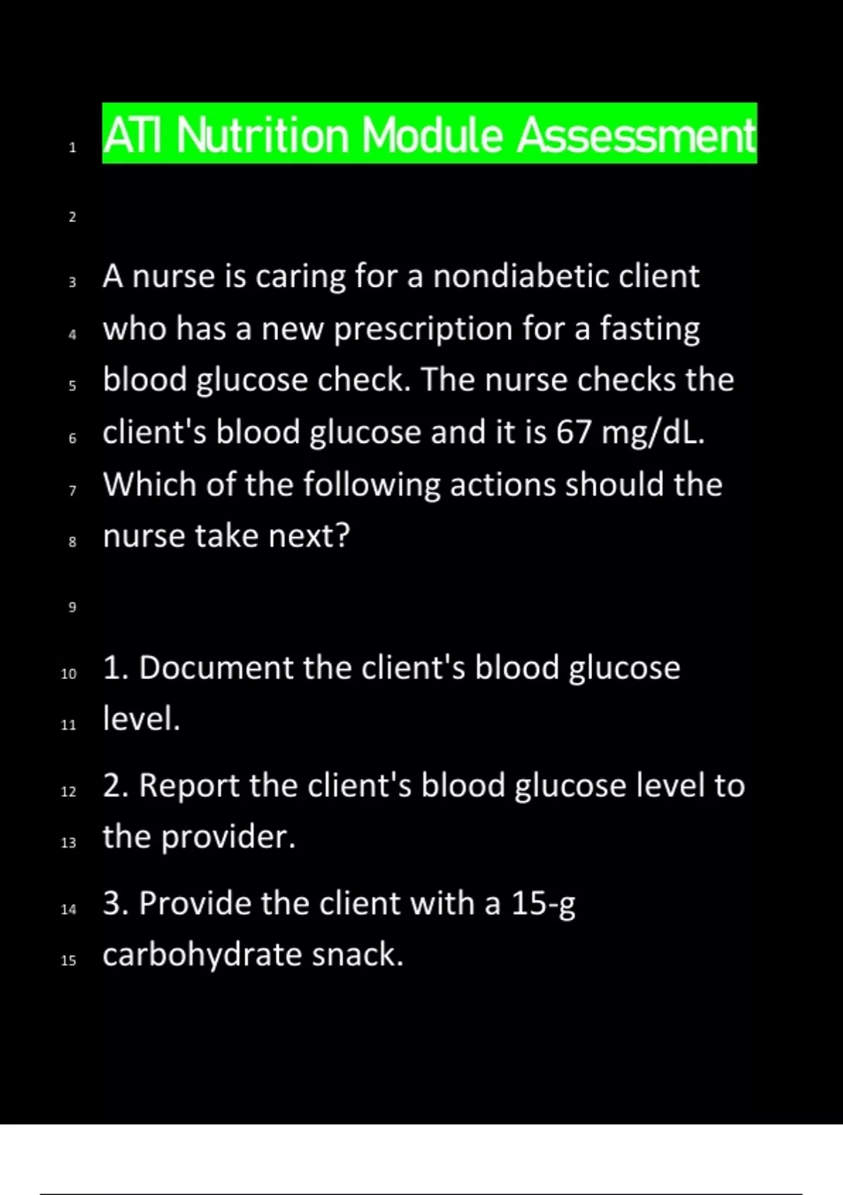 ATI Nutrition Module Assessment 1 2 A nurse is caring for a nondiabetic client 3 who has a new prescription for a fasting 4 blood glucose check. The nurse checks the 5 client's blood glucose and it is 67 mg/dL. 6 Which of the following actions should the 7 nurse take next? 8 9 1. Document the client's bl ood glucose 10 level. 11 2. Report the client's blood glucose level to 12 the provider. 13 3. Provide the client with a 15 -g 14 carbohydrate snack. 15 4. Recheck the blood sugar in 15 min. - 16 ANSWER -3. Provide the client with a 15 -g 17 carbohydrate snack. 18 19 A nurse is caring for a client who is receiving 20 tube feedings via PEG. Which of the 21 following actions should the nurse 22 implement in order to help prevent the 23 client from aspirating? 24 25 1. Keep the client's head elevated to at least 26 30° for a minimum of 1 hr after a feeding. 27 2. Verify the initial tube placement with an 28 x-ray after the first feeding. 29 3. Check the client's tube feeding tolerance 30 every 12 hr. 31 4. Check the pH of the gastric contents each 32 day. - ANSWER -1. Keep the client's head 33 elevated to at least 30° for a minimum of 1 34 hr after a feeding. 35 36 A nurse is caring for a client who is 37 prescribed a low glycemic index diet. The 38 client states, "I don't understand what this 39 means." Which of the following responses 40 should the nurse make? (Select all that 41 apply.) 42 43 1. "The glycemic index of a food relates to 44 its ability to increase the blood glucose 45 level." 46